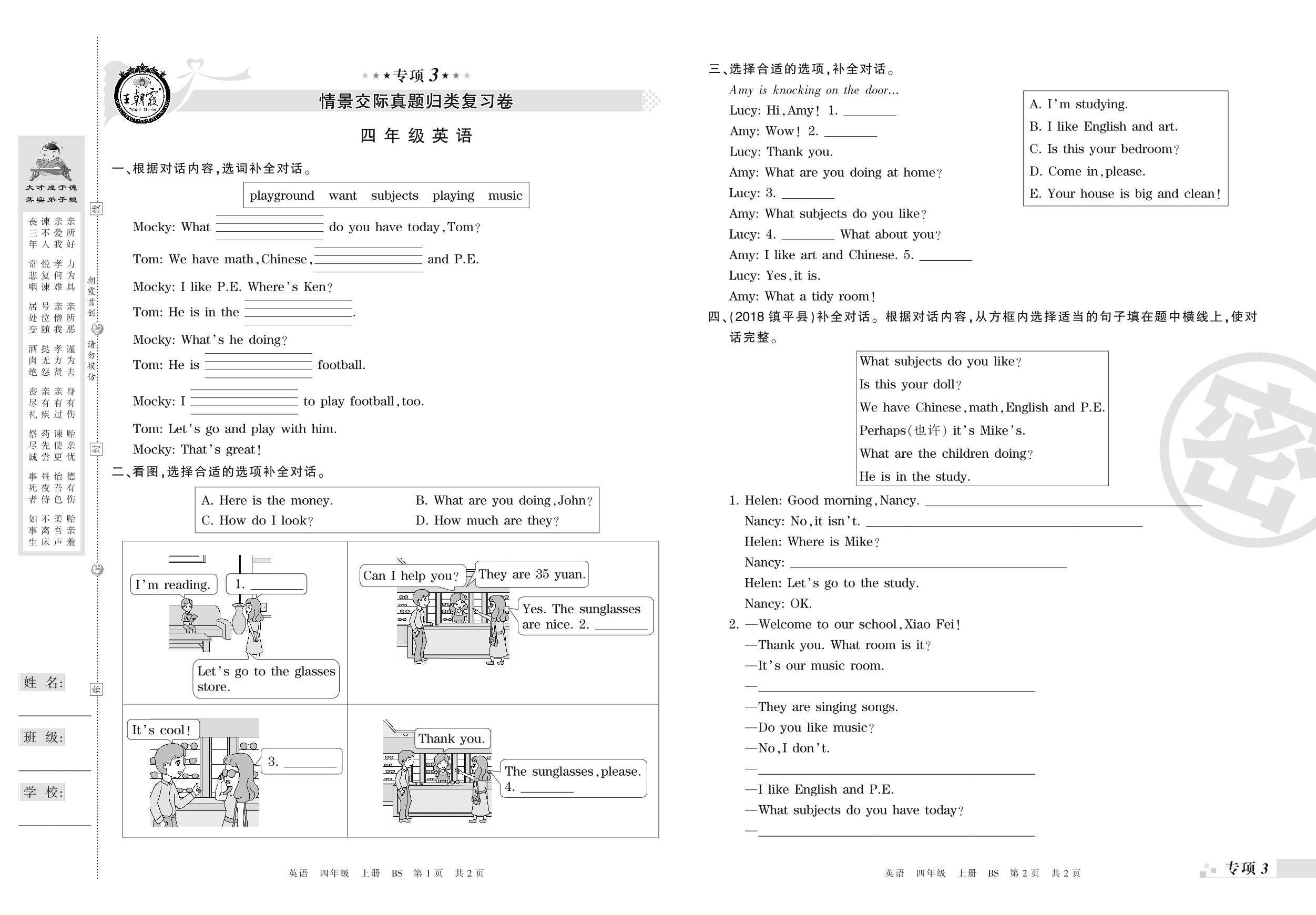 王朝霞期末专项卷——情景交际、阅读理解真题归类复习四年级上册英语(北师版)_R21080794122【0】