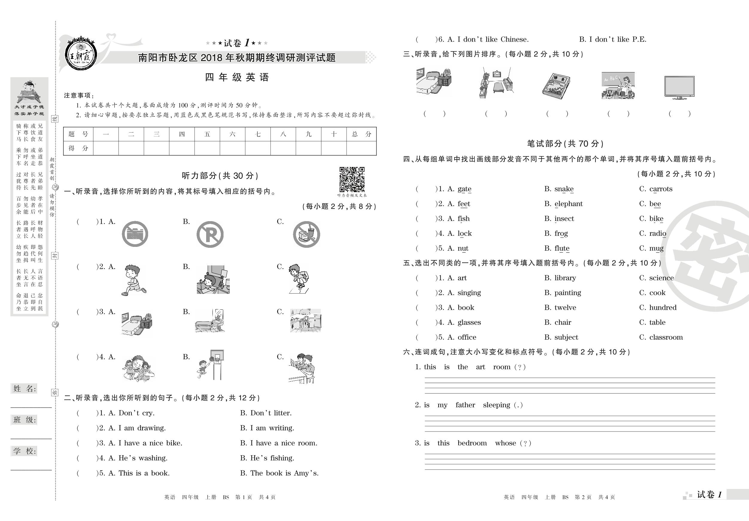 2018-2019学年第一学期南阳市卧龙区四年级英语试卷(北师版)【1】