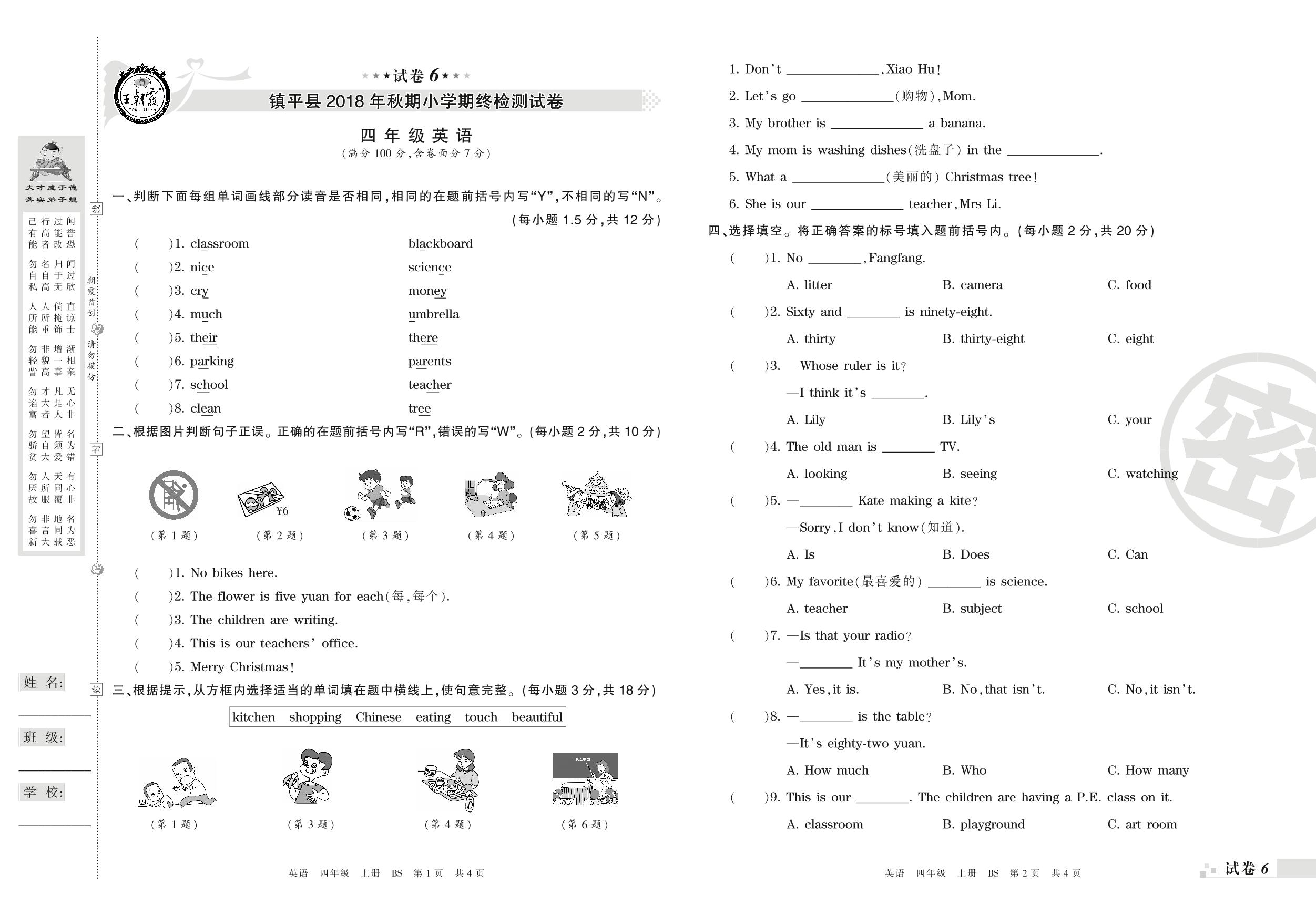 2018-2019学年第一学期南阳市镇平县四年级英语试卷(北师版)【6】