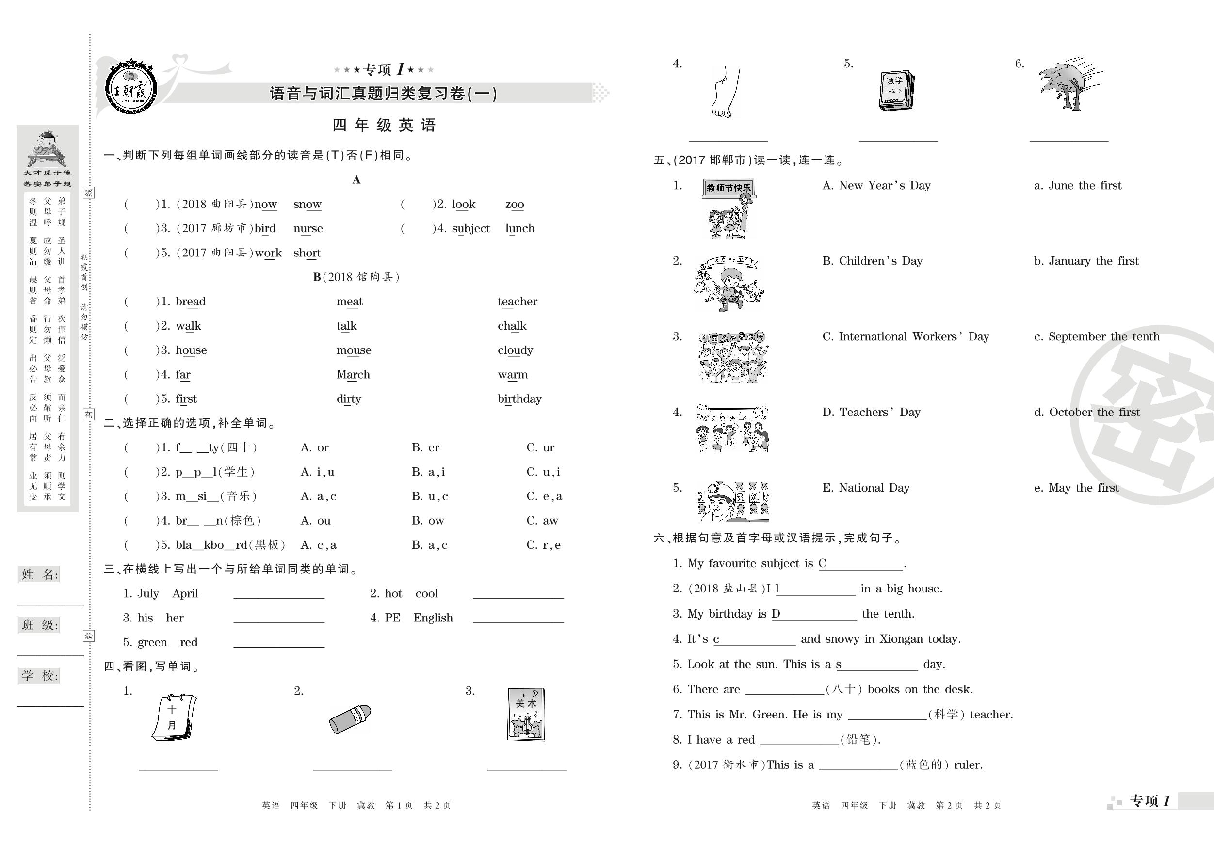 王朝霞期末专项卷——语音与词汇(一)(二)真题归类复习卷四年级下册英语(冀教版)_R21080794158【0】
