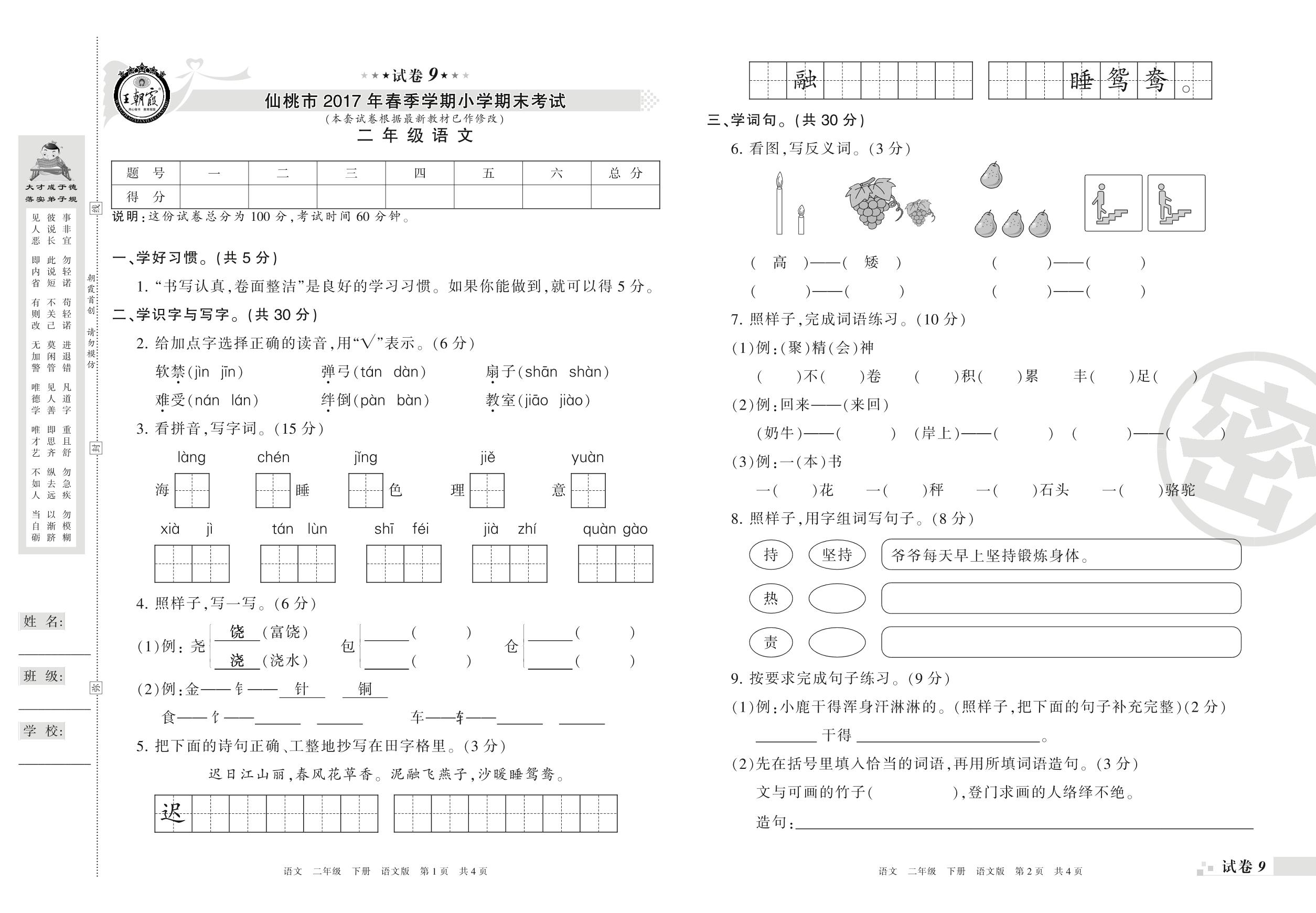 2016-2017学年第二学期仙桃市二年级语文试卷(语文版)【9】