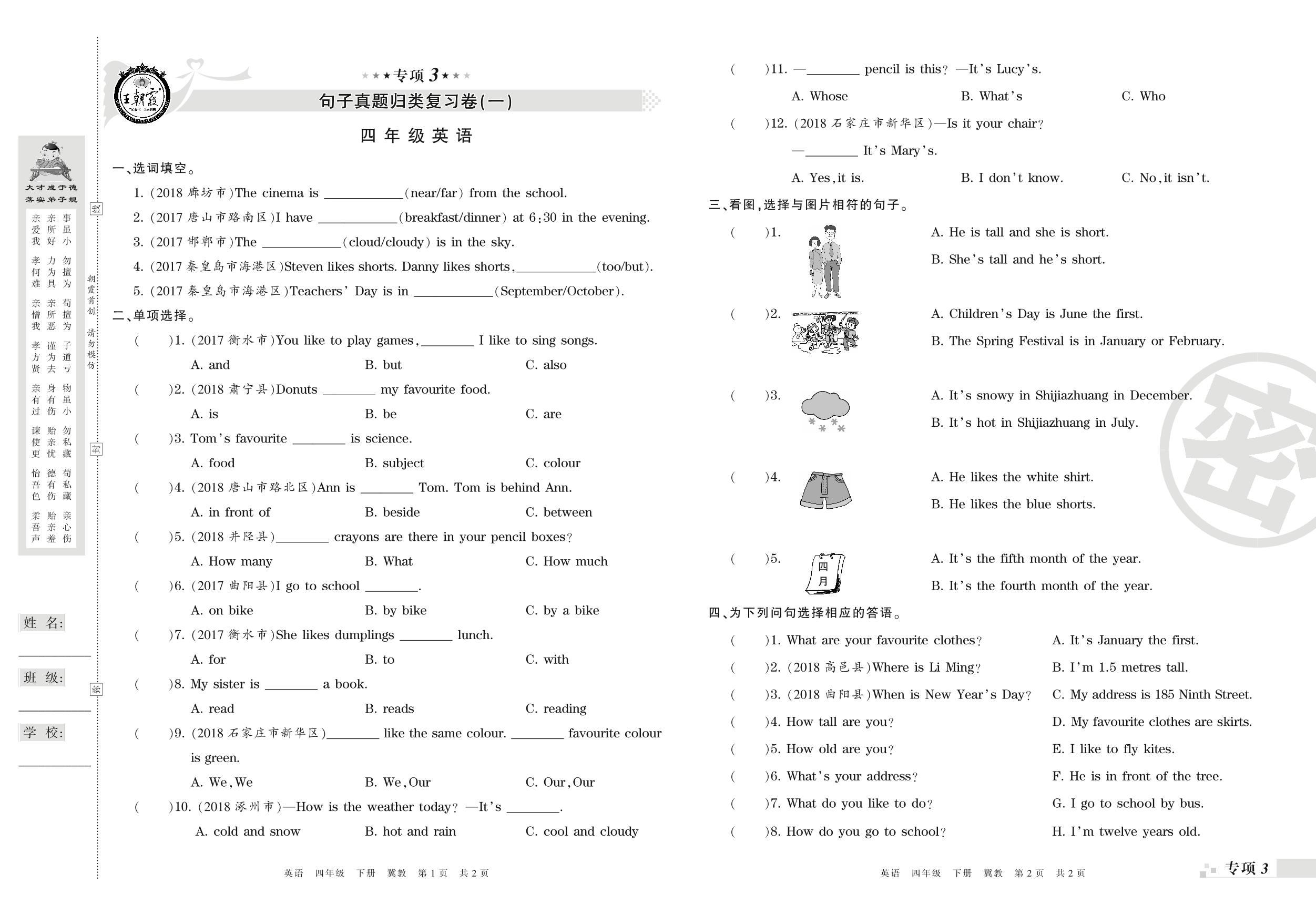 王朝霞期末专项卷——句子(一)(二)真题归类复习卷四年级下册英语(冀教版)_R21080794201【0】