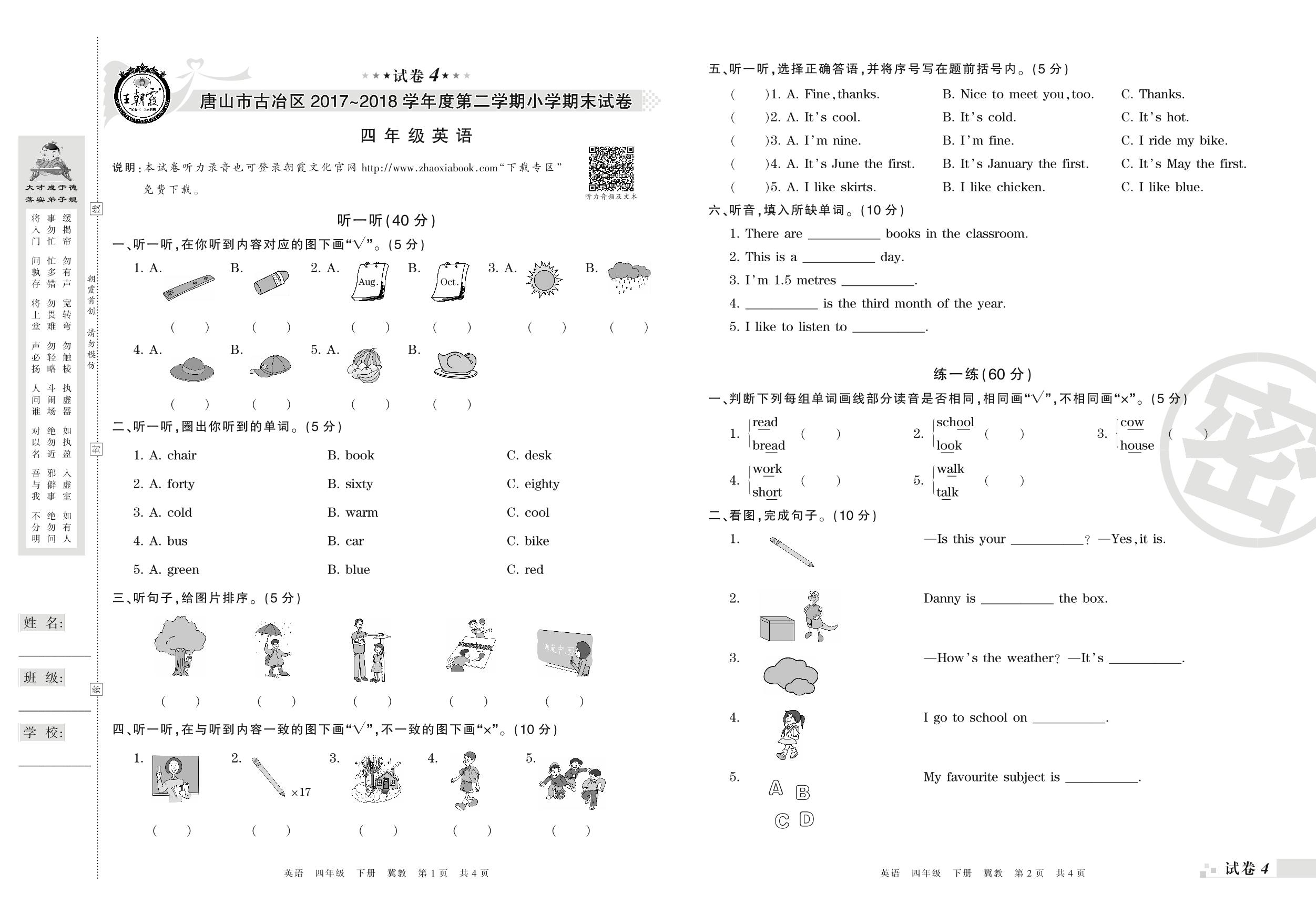 2017-2018学年第二学期唐山市古冶区四年级英语试卷(冀教版)【4】