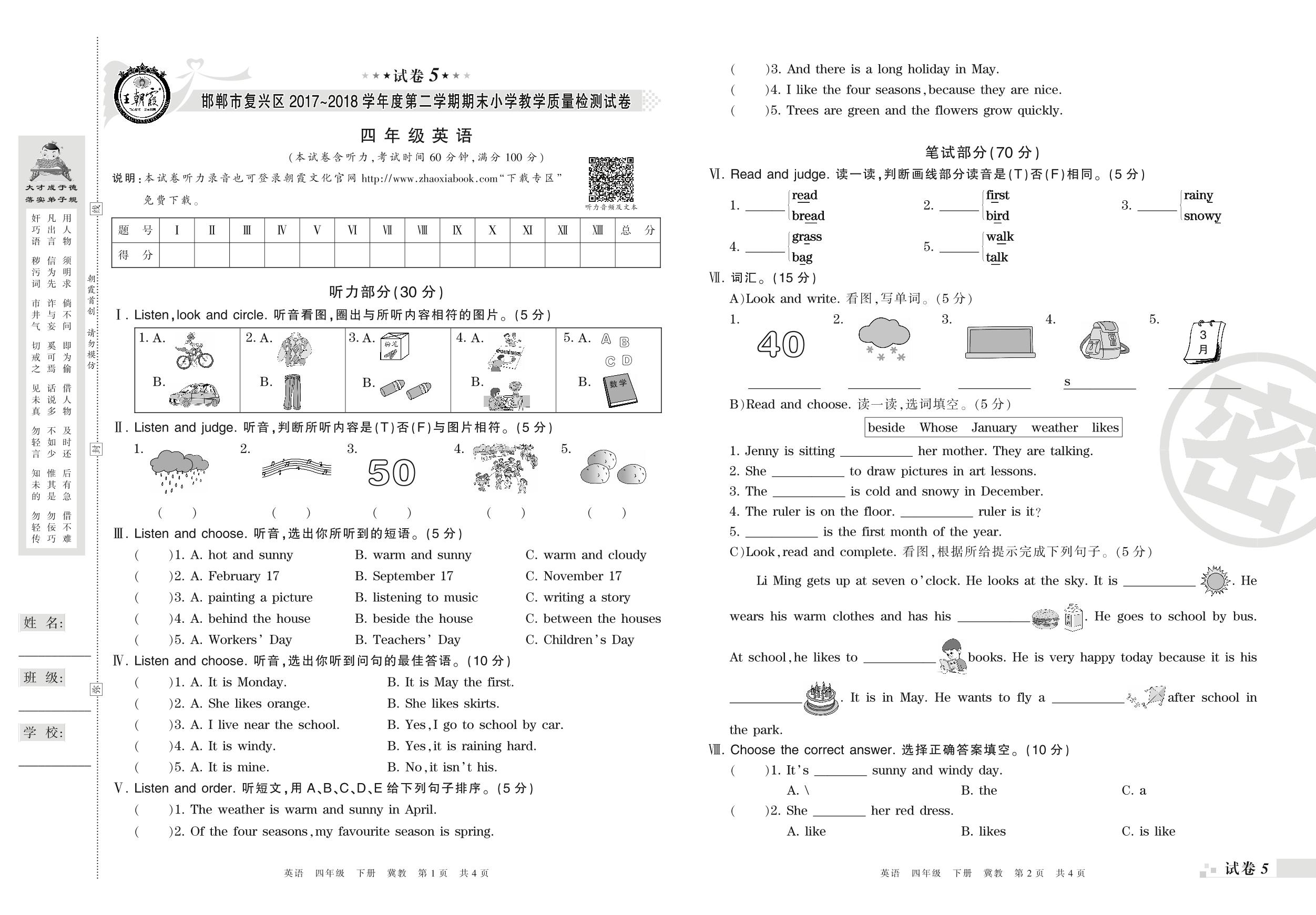 2017-2018学年第二学期邯郸市复兴区四年级英语试卷(冀教版)【5】