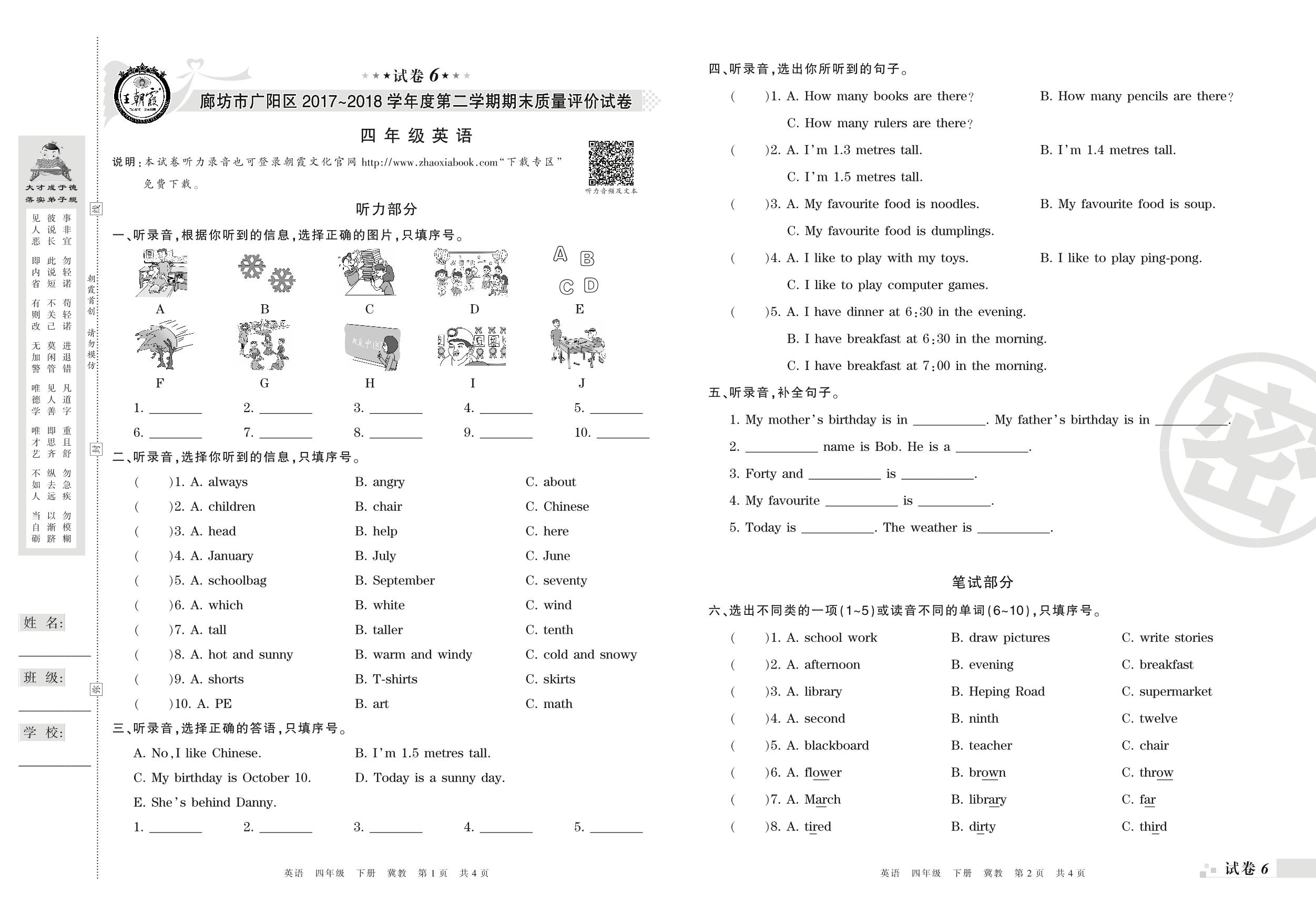2017-2018学年第二学期廊坊市广阳区四年级英语试卷(冀教版)【6】