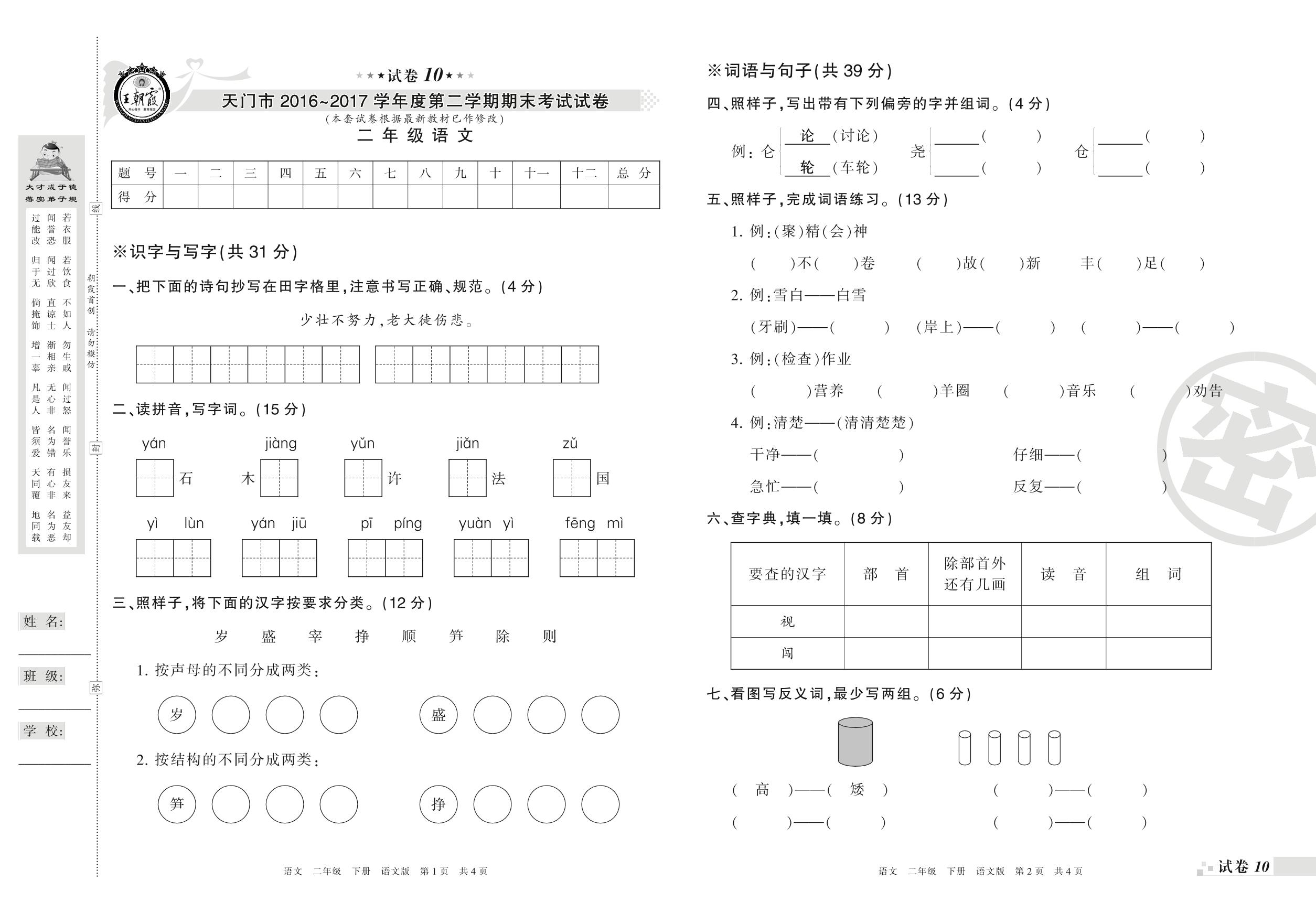 2016-2017学年第二学期天门市二年级语文试卷(语文版)【10】