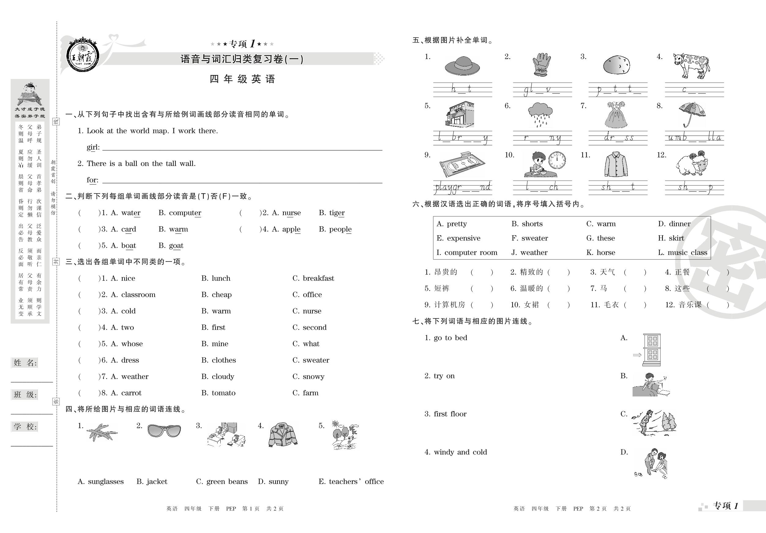 王朝霞期末专项卷——语音与词汇(一)(二)真题归类复习卷四年级下册英语(PEP版)_R21080794306【0】