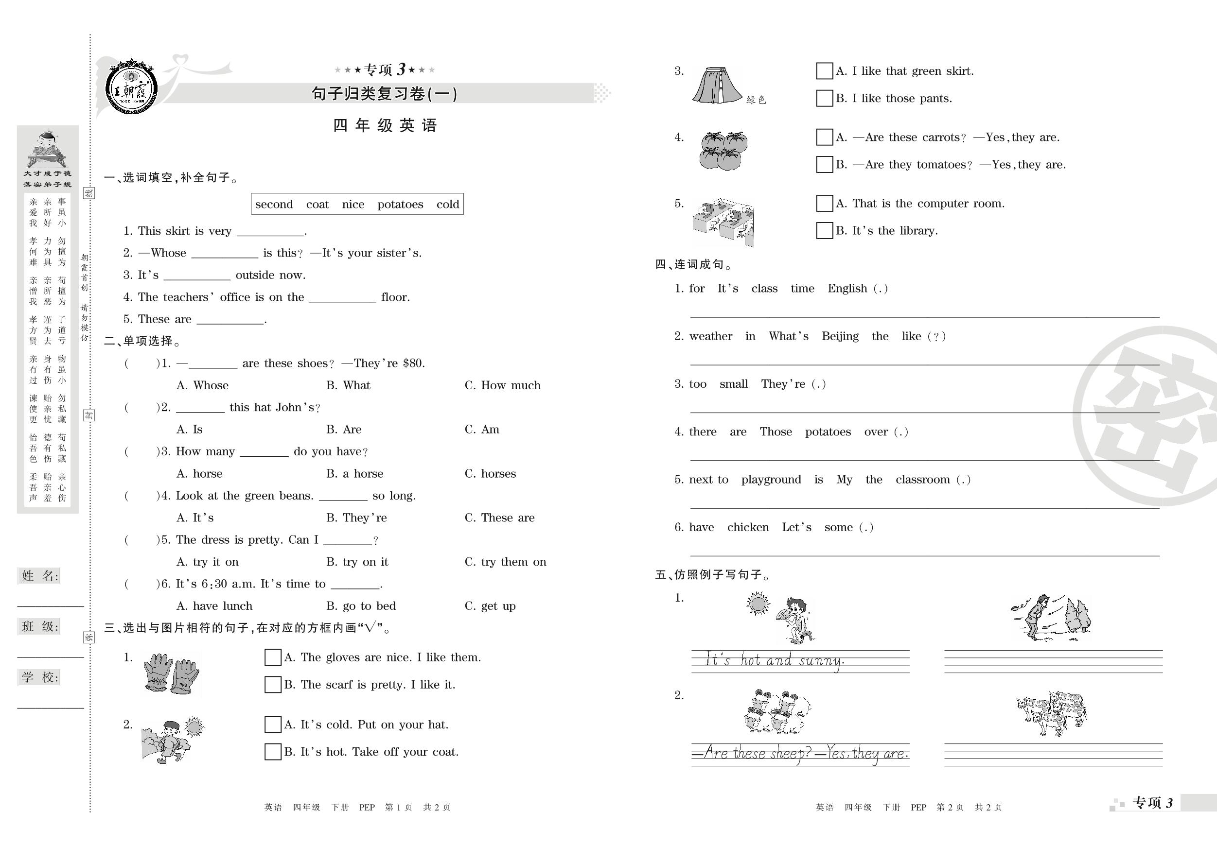 王朝霞期末专项卷——句子(一)(二)真题归类复习卷四年级下册英语(PEP版)_R21080794309【0】