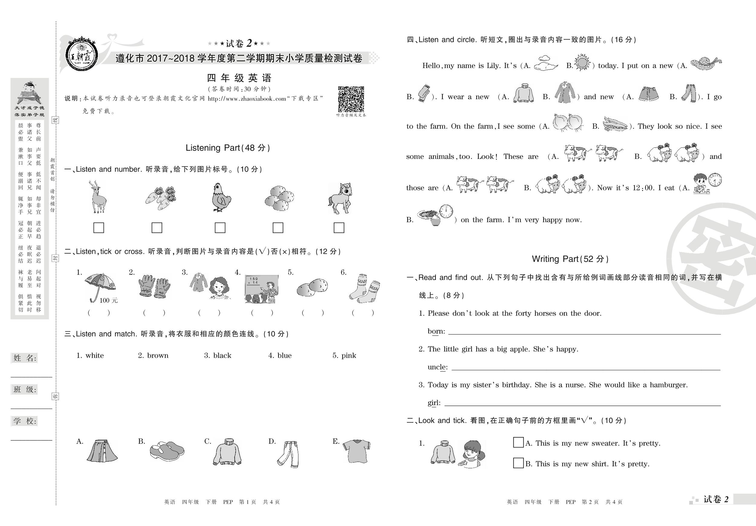 2017-2018学年第二学期遵化市四年级英语试卷(PEP版)【2】