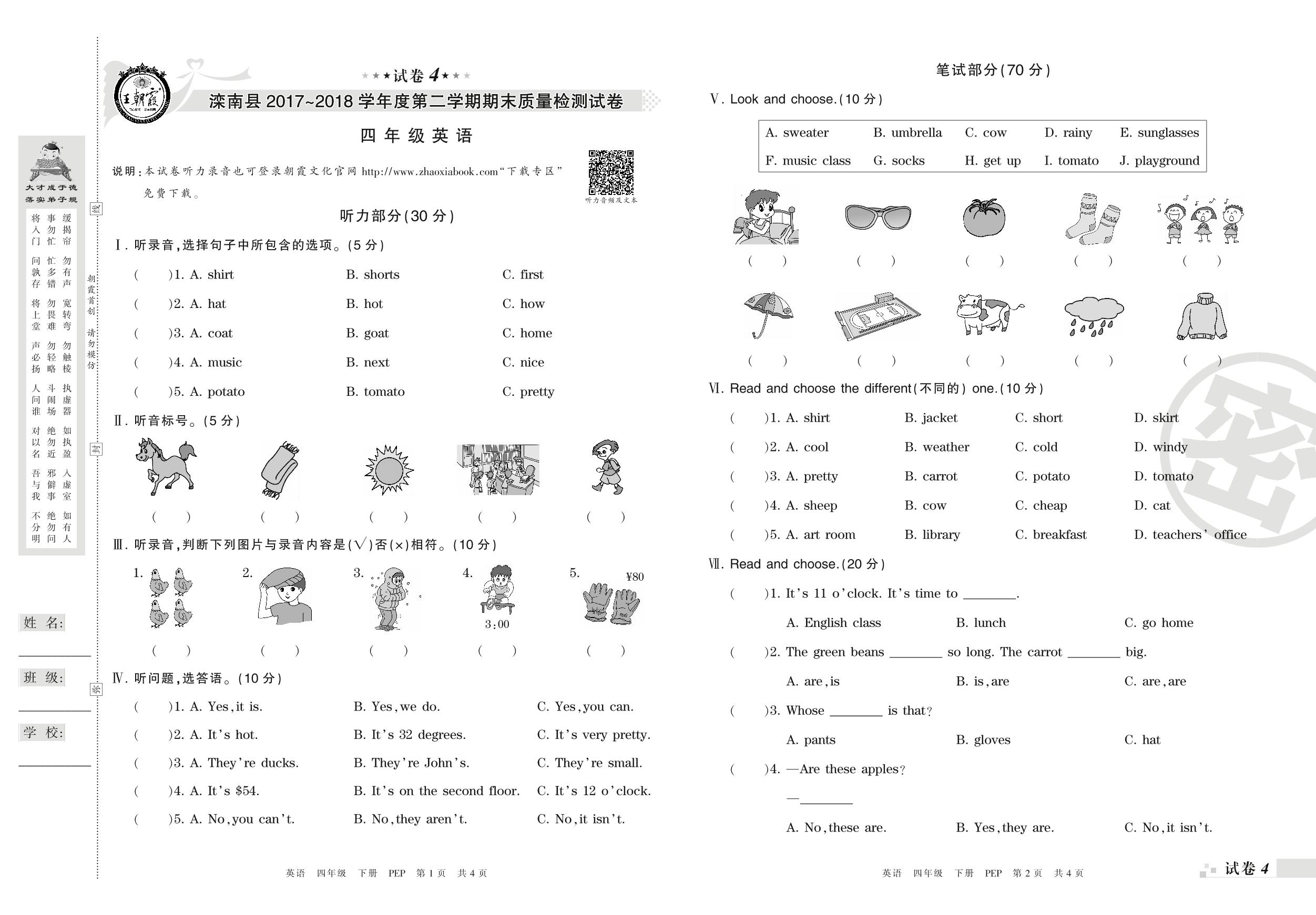 2017-2018学年第二学期唐山市滦南县四年级英语试卷(PEP版)【4】