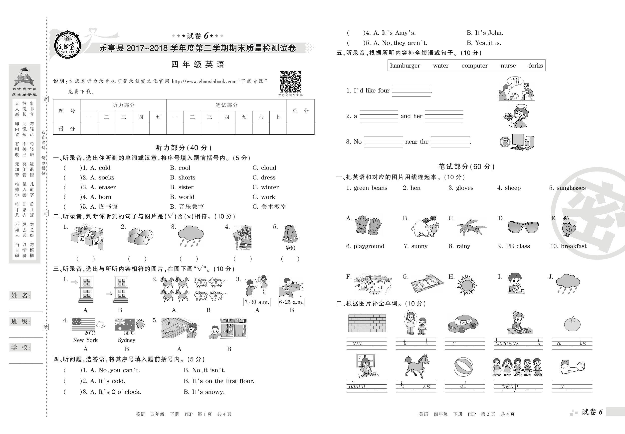 四年级英语人教PEP版(三起始)下册期末卷