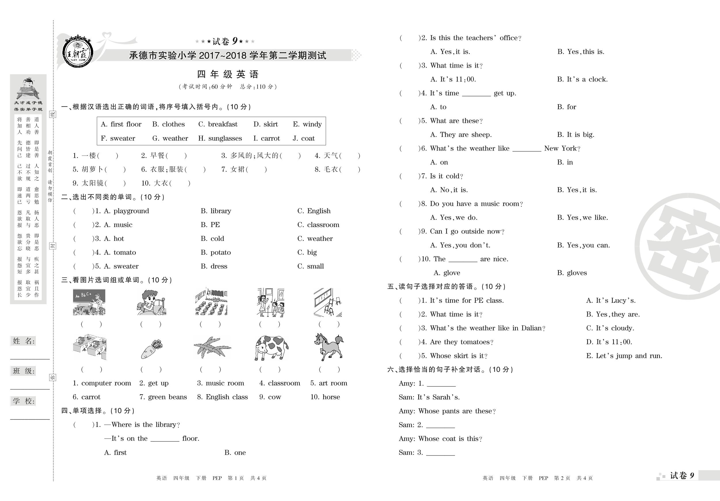 2017-2018学年第二学期承德市实验小学四年级英语试卷(PEP版)【9】