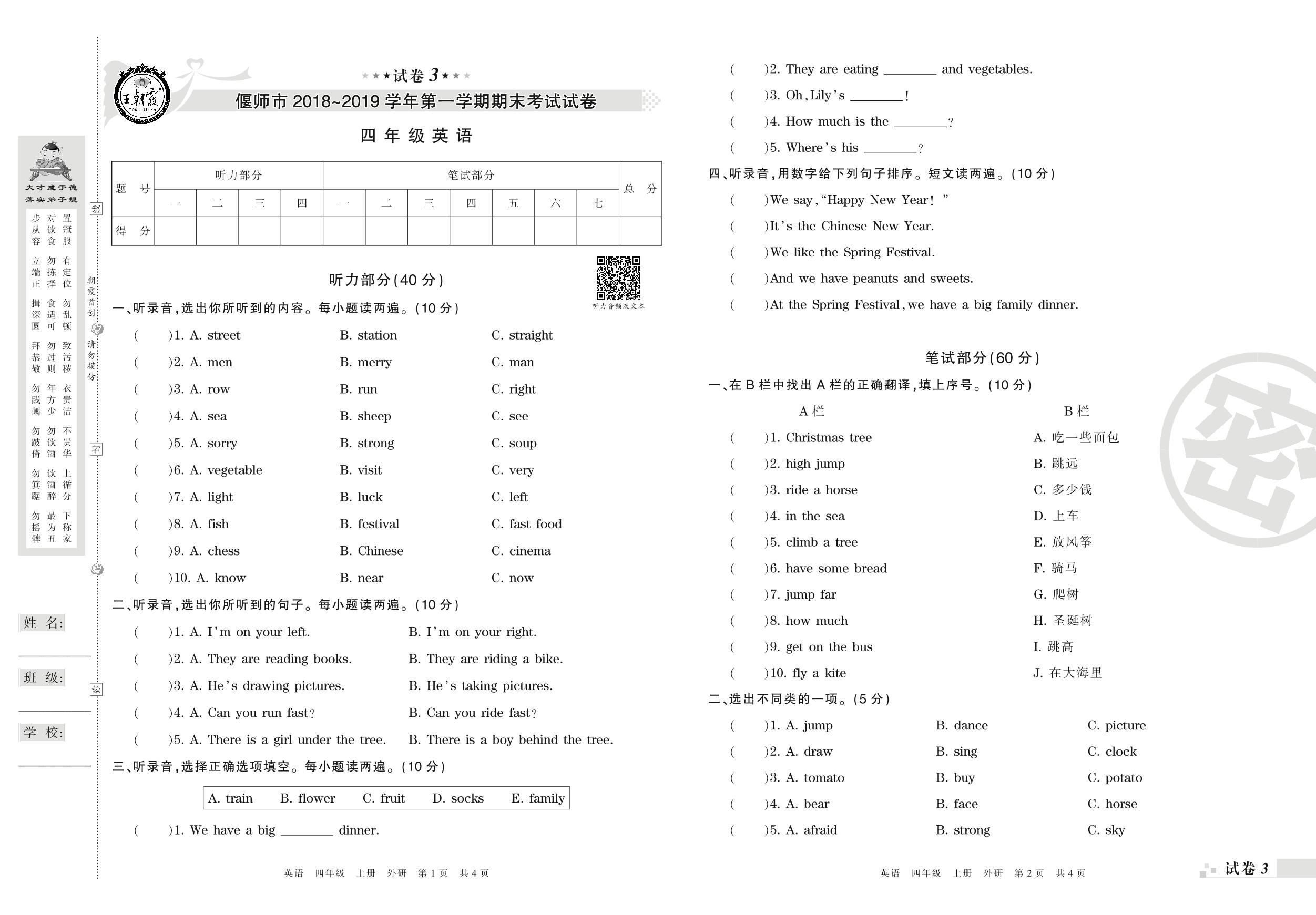 2018-2019学年第一学期偃师市四年级英语试卷(外研版)【3】
