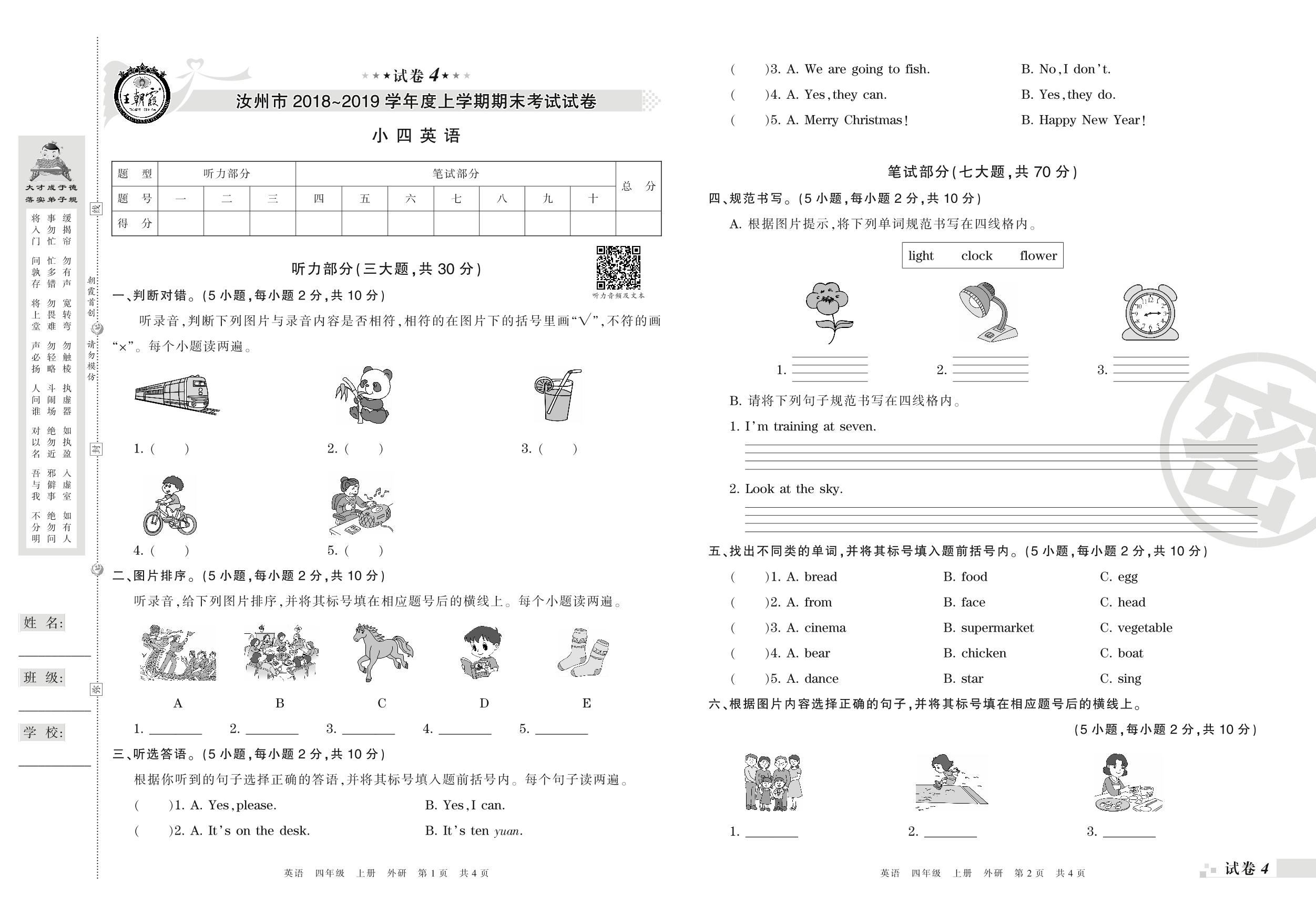 2018-2019学年第一学期汝州市四年级英语试卷(外研版)【4】