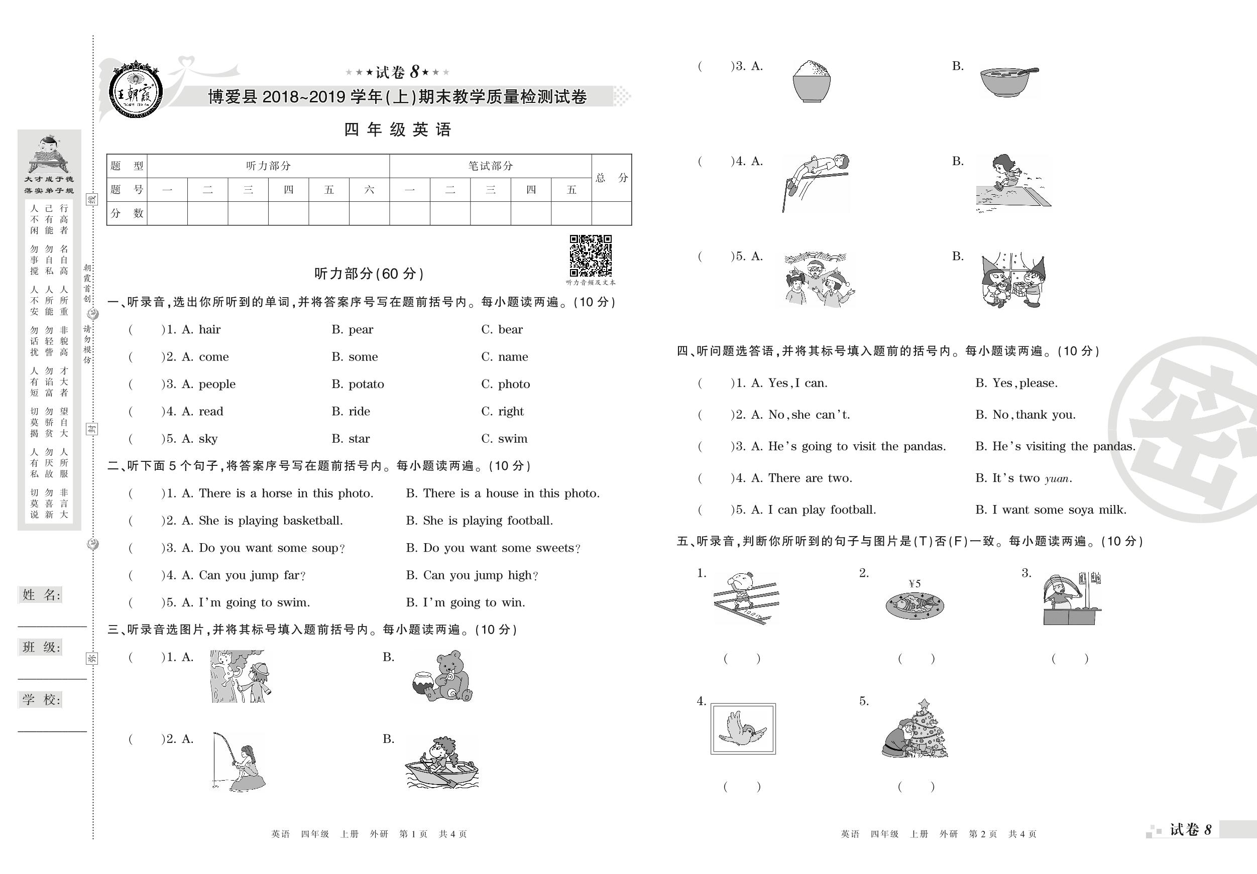 2018-2019学年第一学期焦作市博爱县四年级英语试卷(外研版)【8】