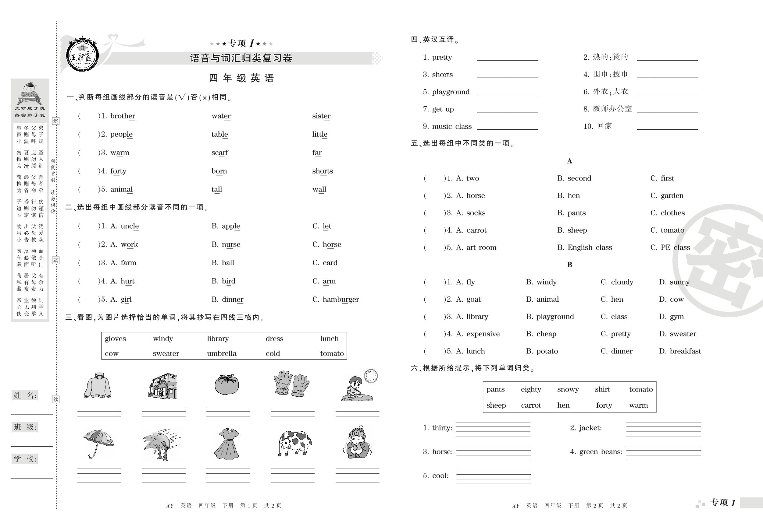 王朝霞期末专项卷——语音与词汇、句子真题归类复习卷四年级下册英语(PEP版)_R21080794513【0】