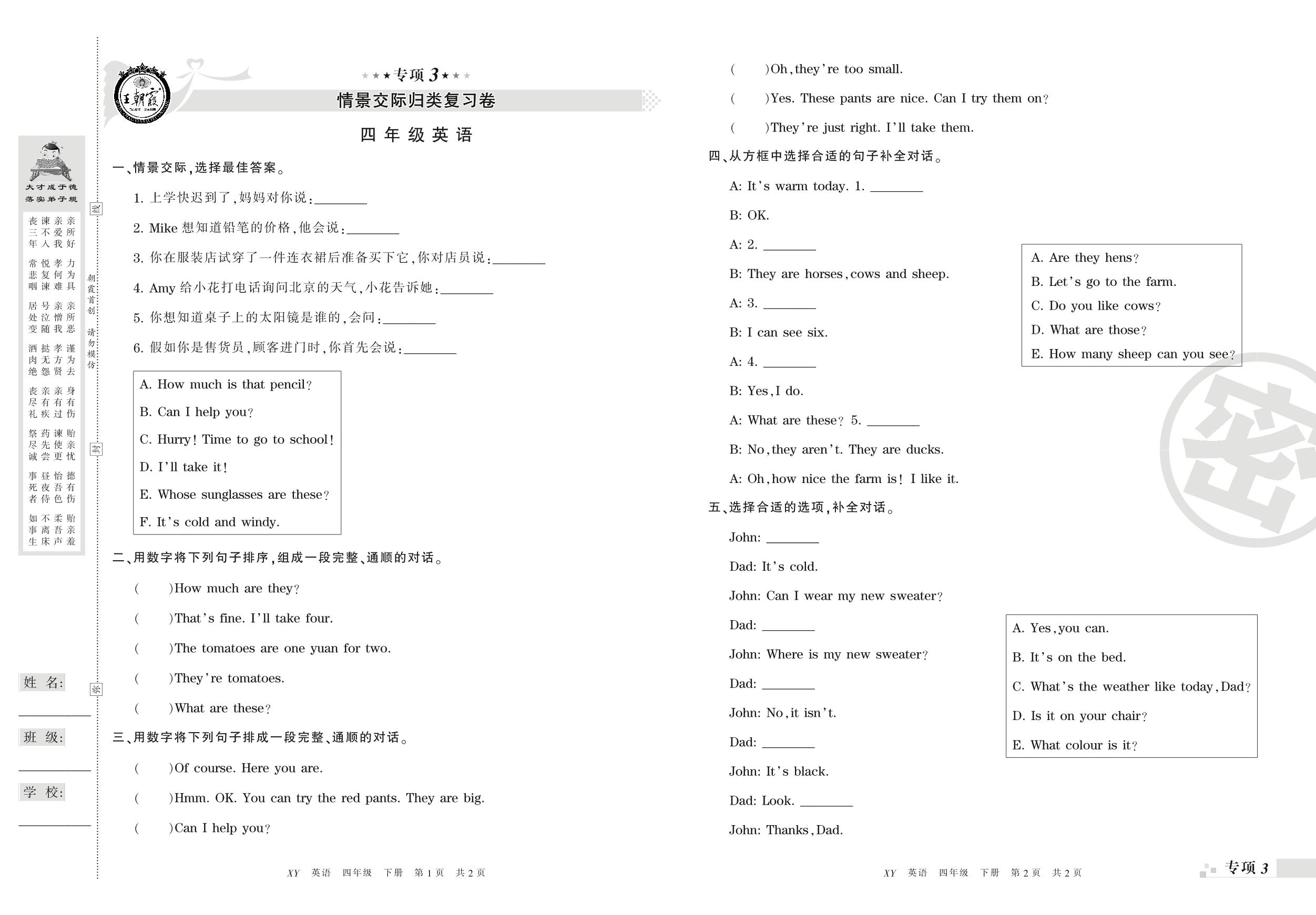 王朝霞期末专项卷——情景交际、阅读理解真题归类复习卷四年级下册英语(PEP版)_R21080794518【0】