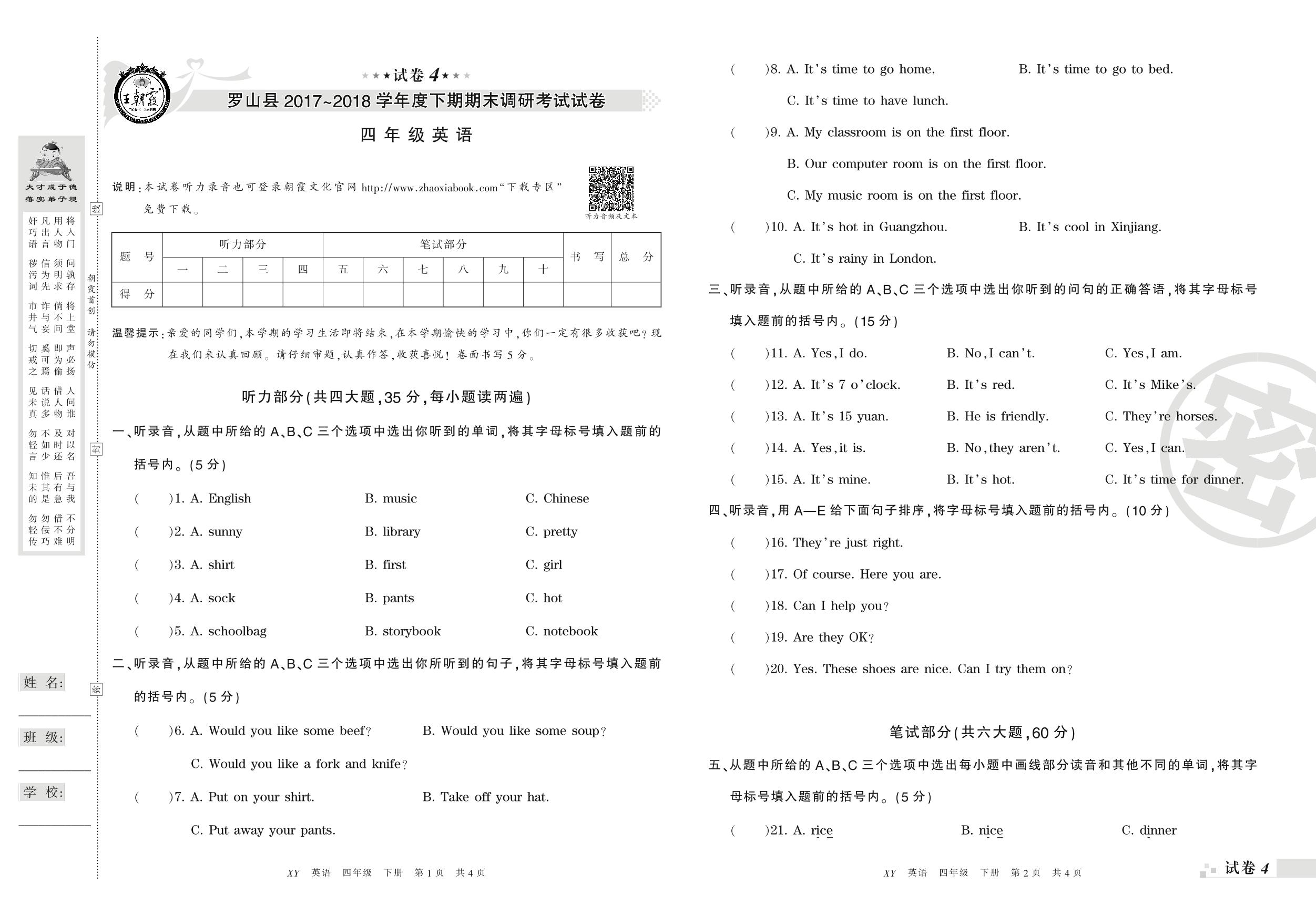 2017-2018学年第二学期信阳市罗山县四年级英语试卷(PEP版)【4】