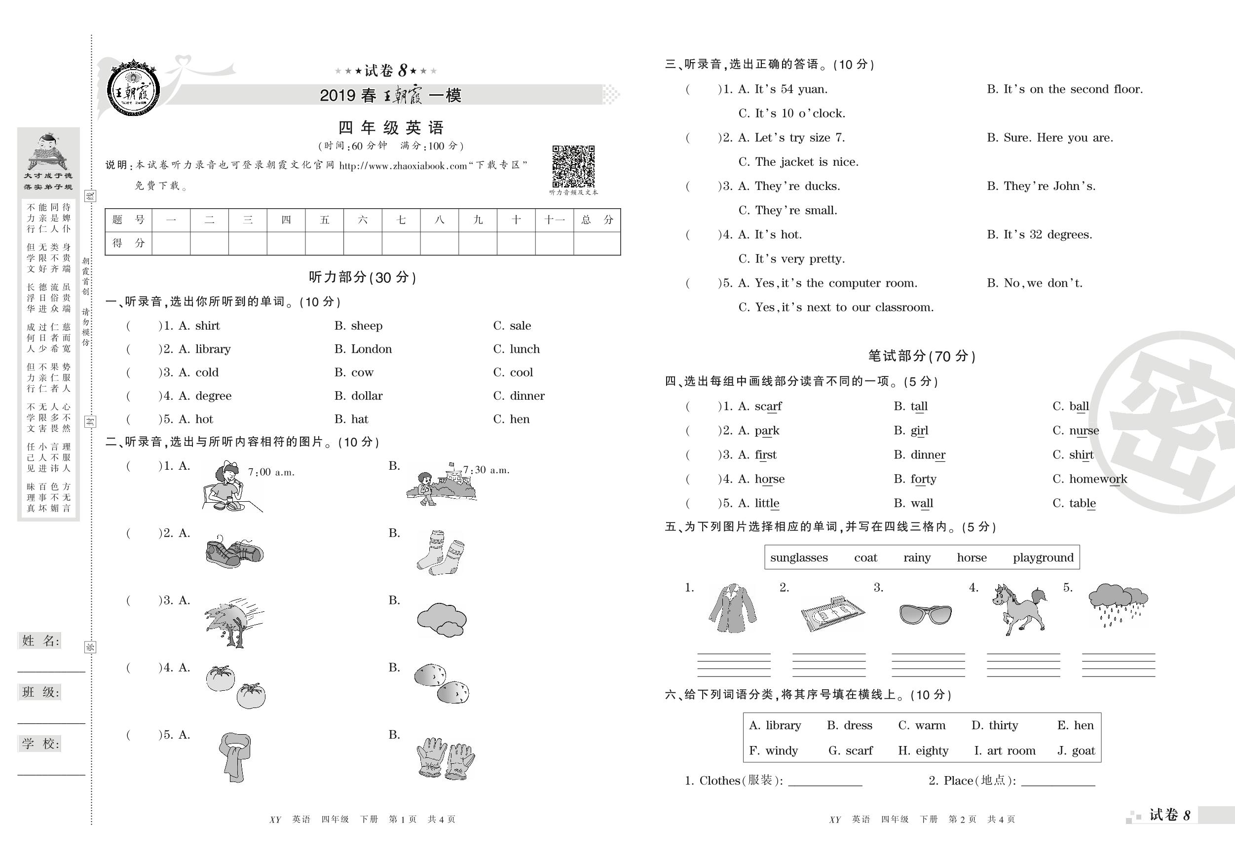 王朝霞期末模拟卷四年级下册英语(PEP版)_R21080794548【8】