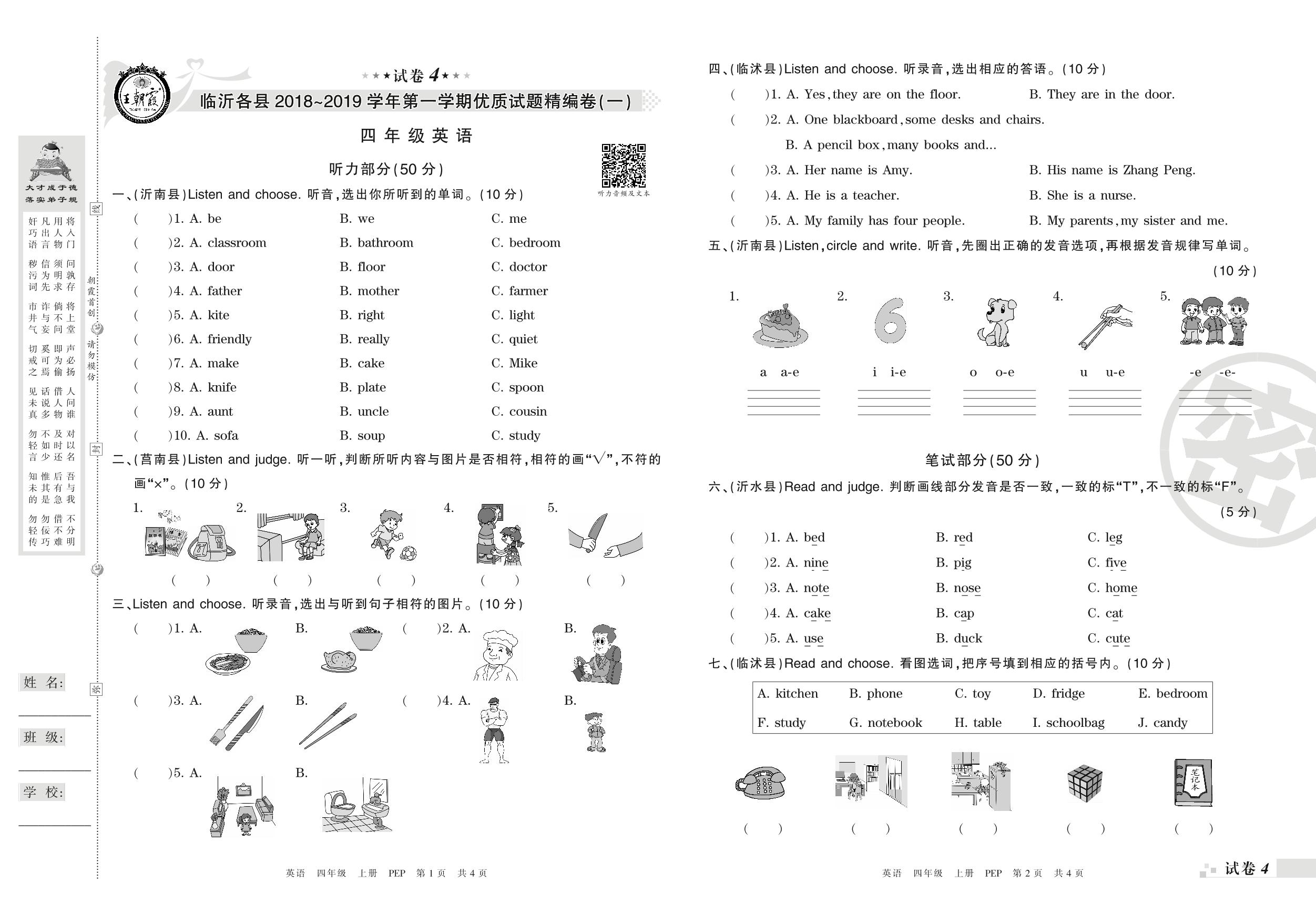 2018-2019学年第一学期临沂市各县优质试题精编卷(一)四年级英语试卷(PEP版)【4】
