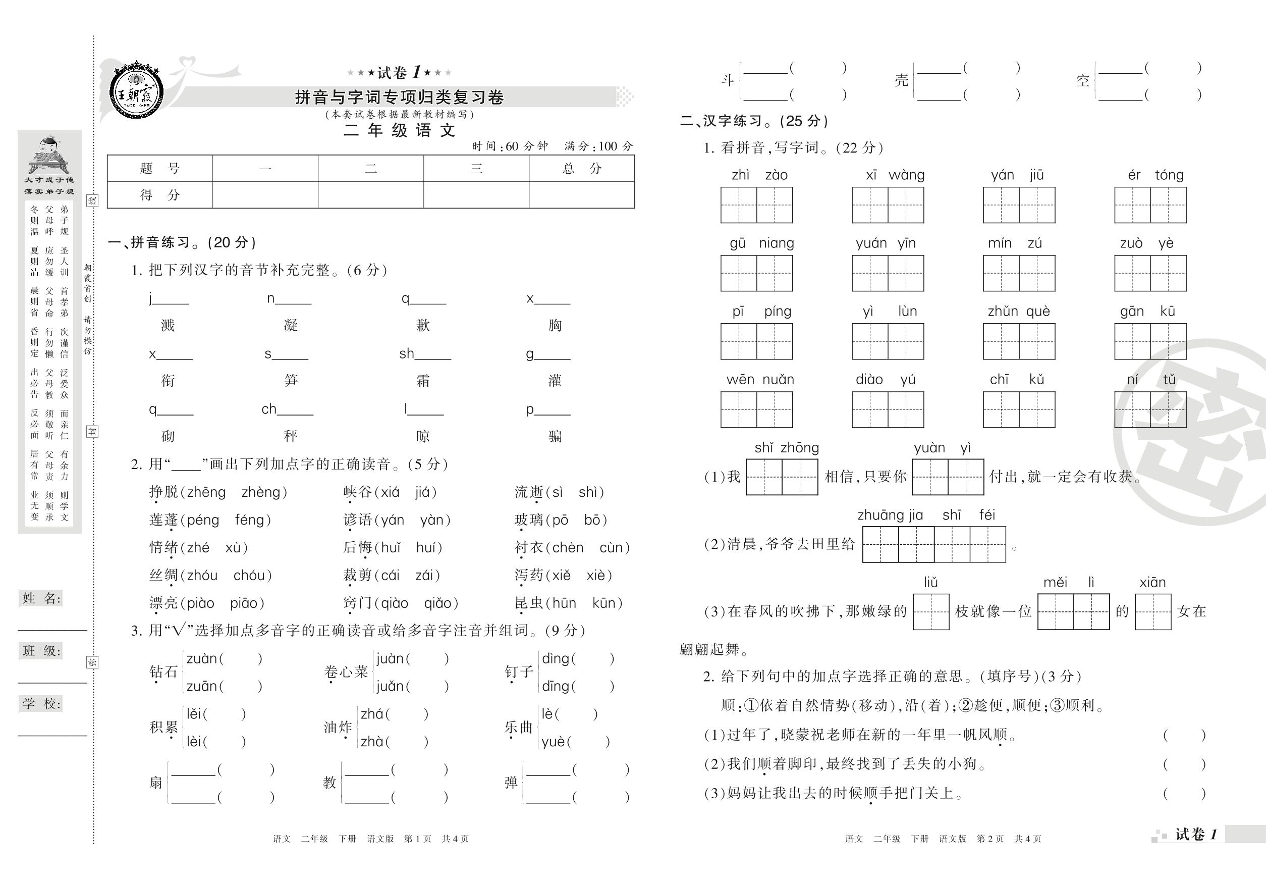 王朝霞期末专项卷——拼音与字词专项归类复习卷二年级下册语文(语文版)【1】