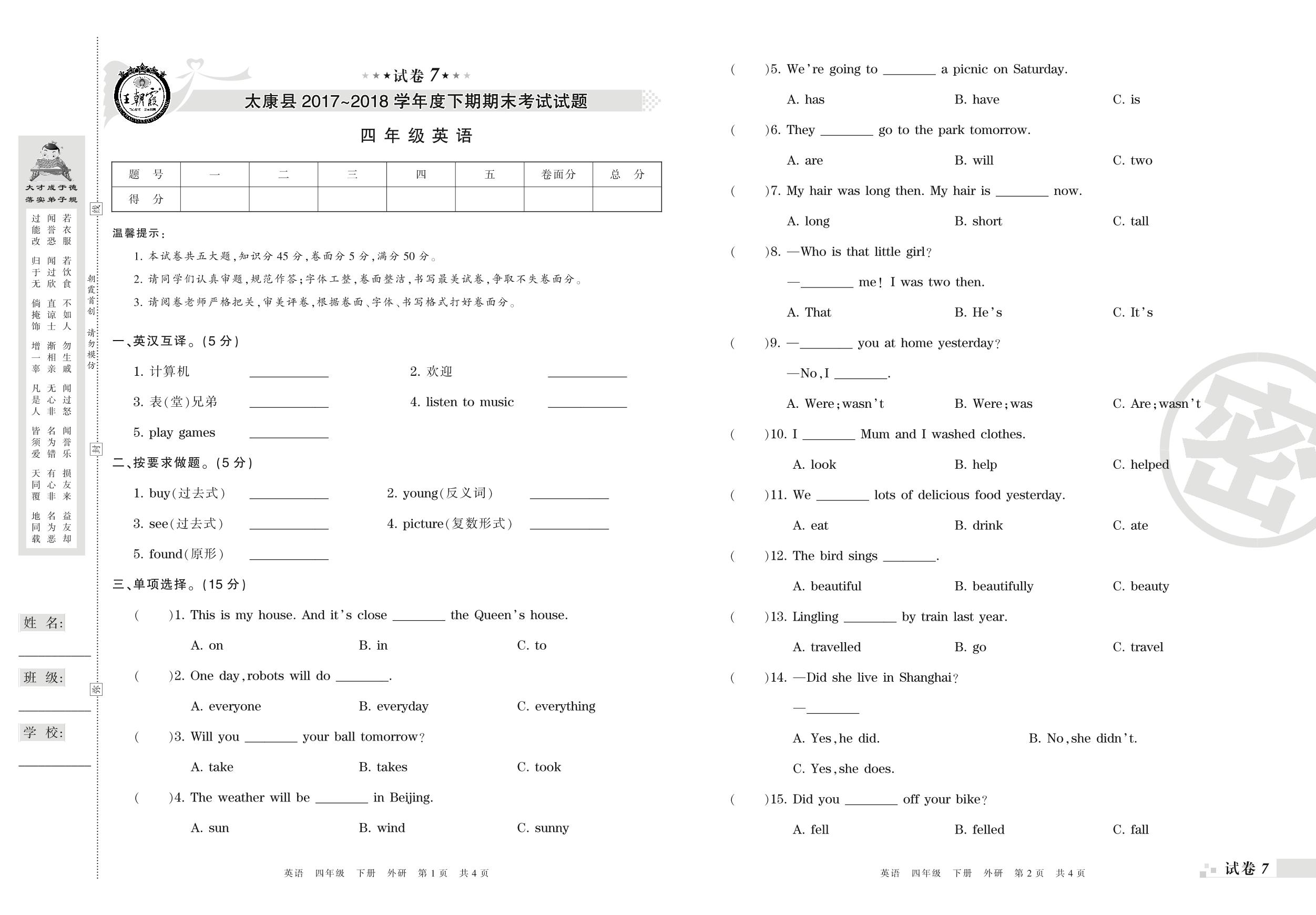 2017-2018学年第二学期周口市太康县四年级英语试卷(外研版)【7】