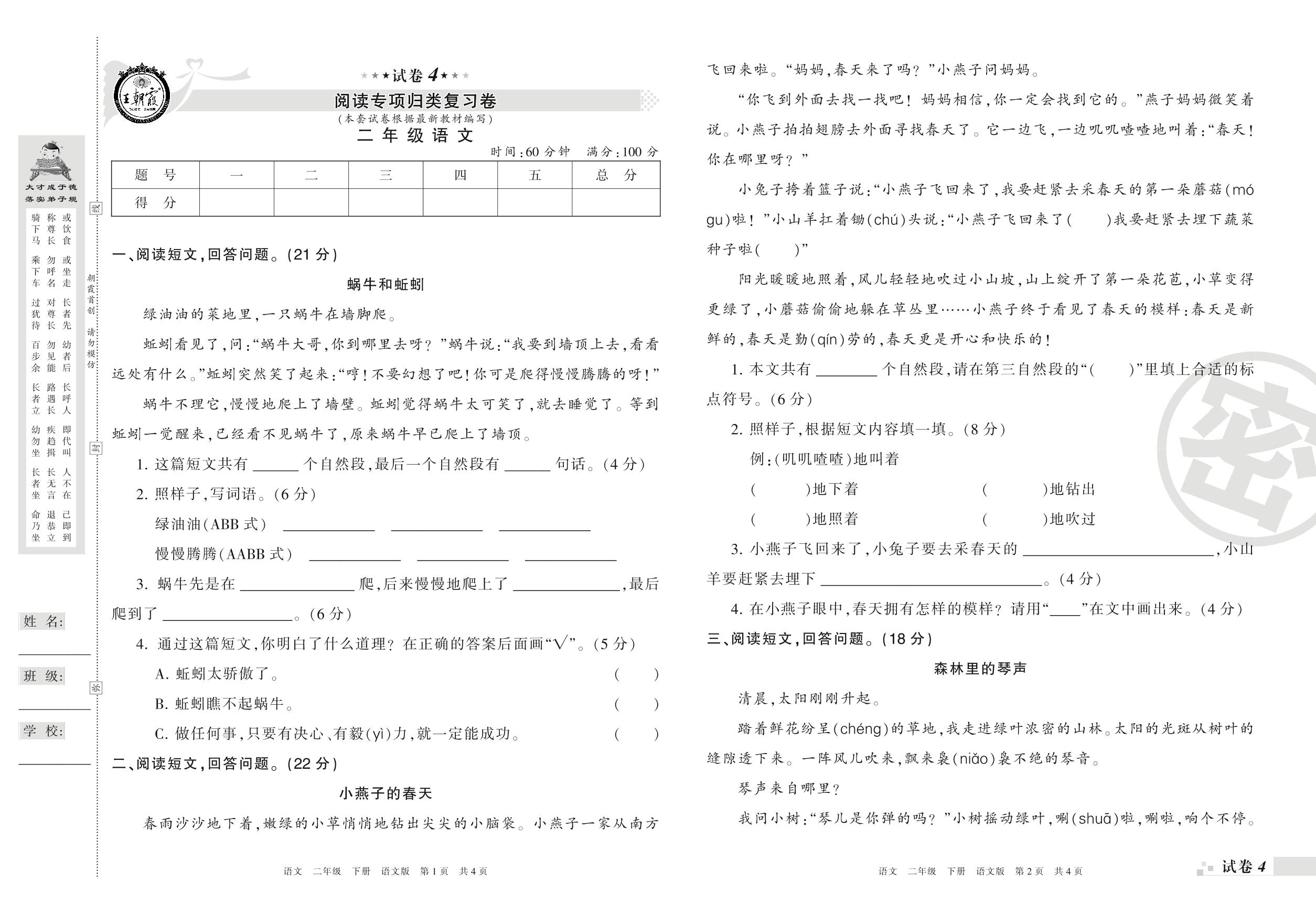 王朝霞期末专项卷——阅读专项归类复习卷二年级下册语文(语文版)_R21080181358【4】