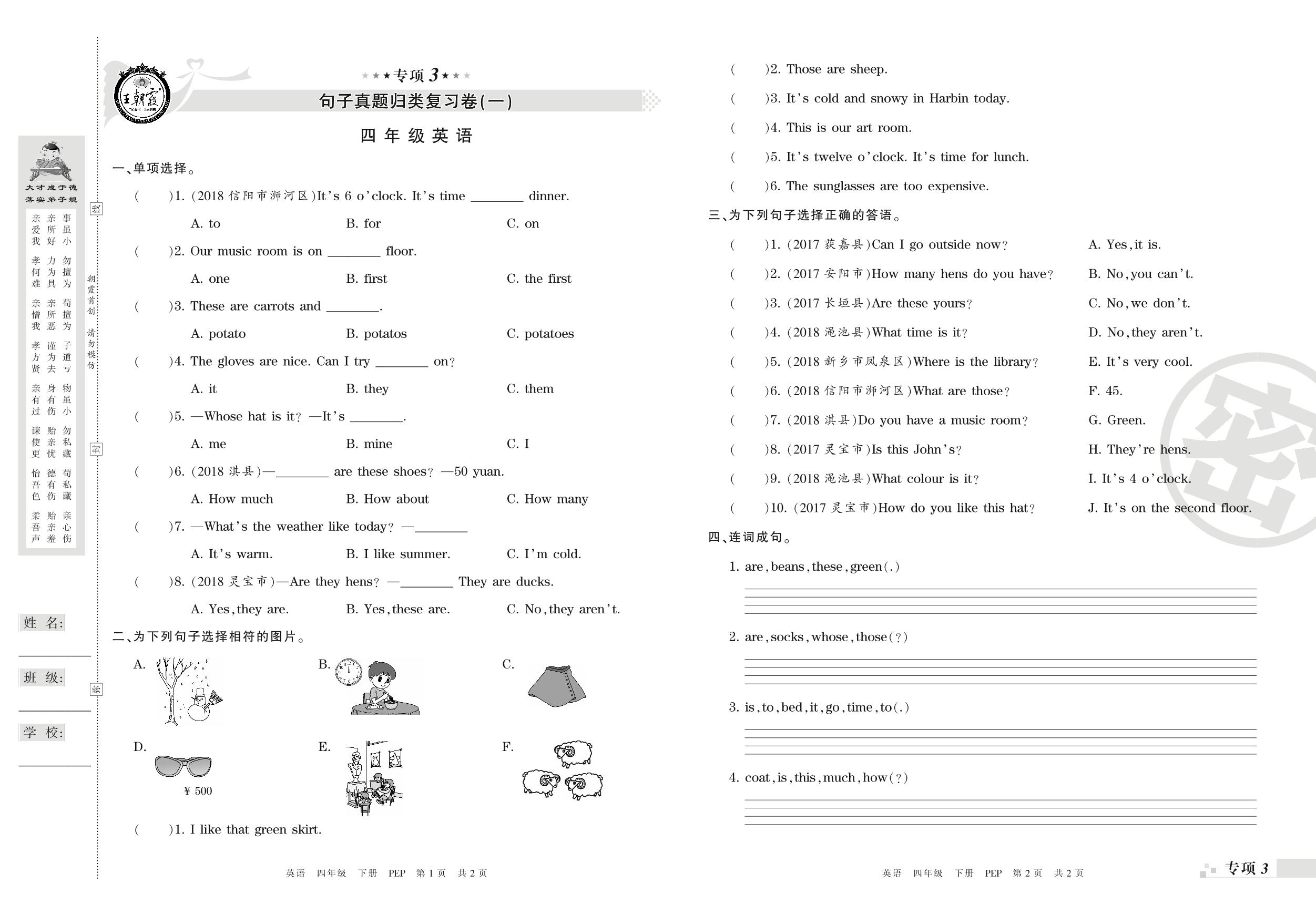 王朝霞期末专项卷——句子(一)(二)真题归类复习卷四年级下册英语(PEP版)_R21080794930【0】