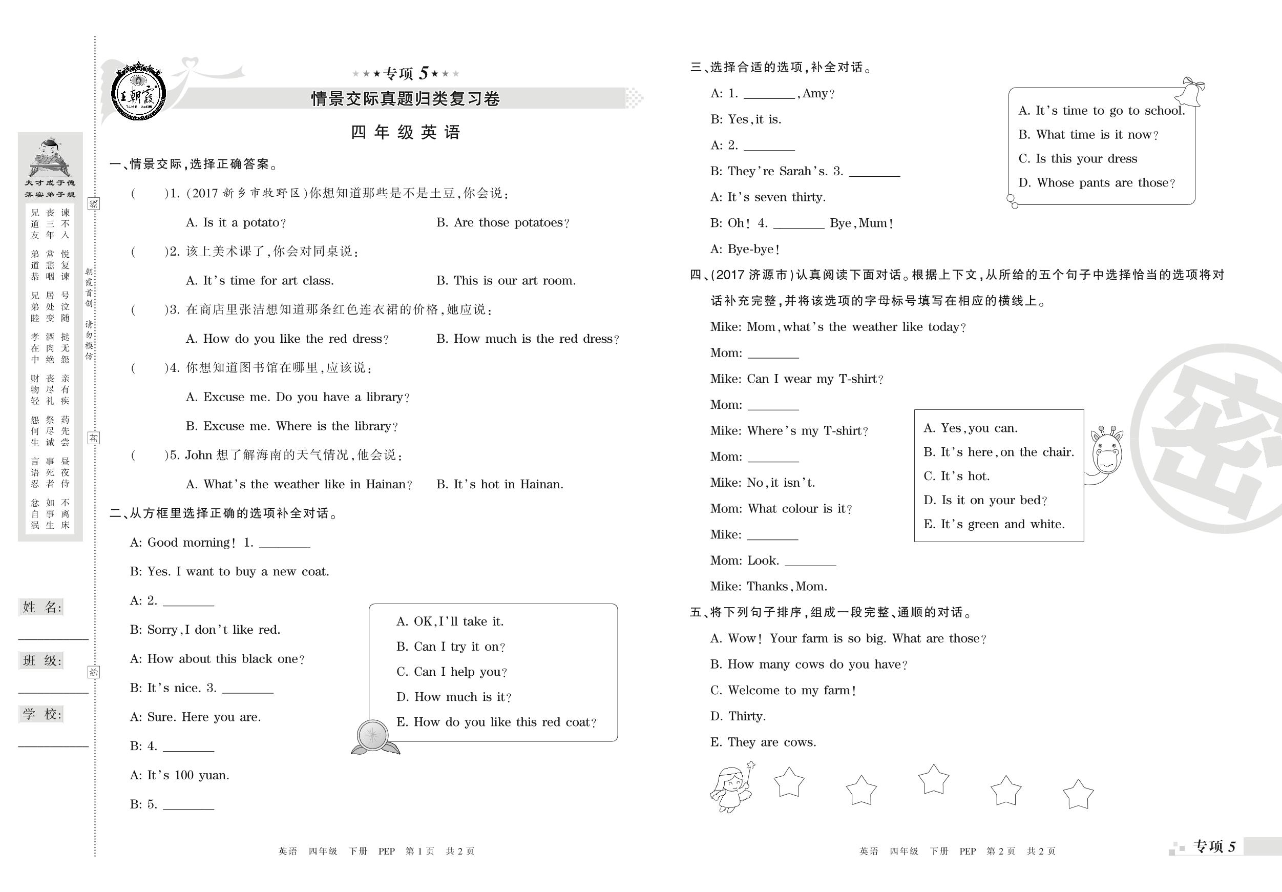 王朝霞期末专项卷——情景交际、阅读理解真题归类复习卷四年级下册英语(PEP版)_R21080794932【0】