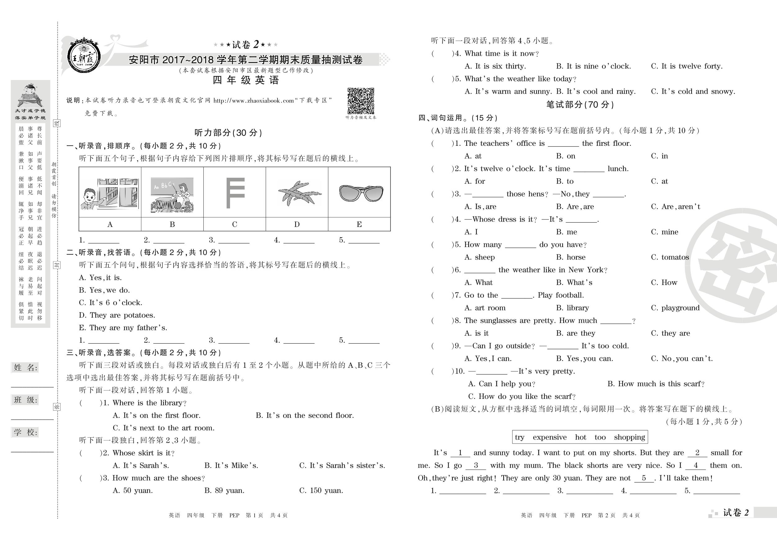 2017-2018学年第二学期安阳市四年级英语试卷(PEP版)【2】