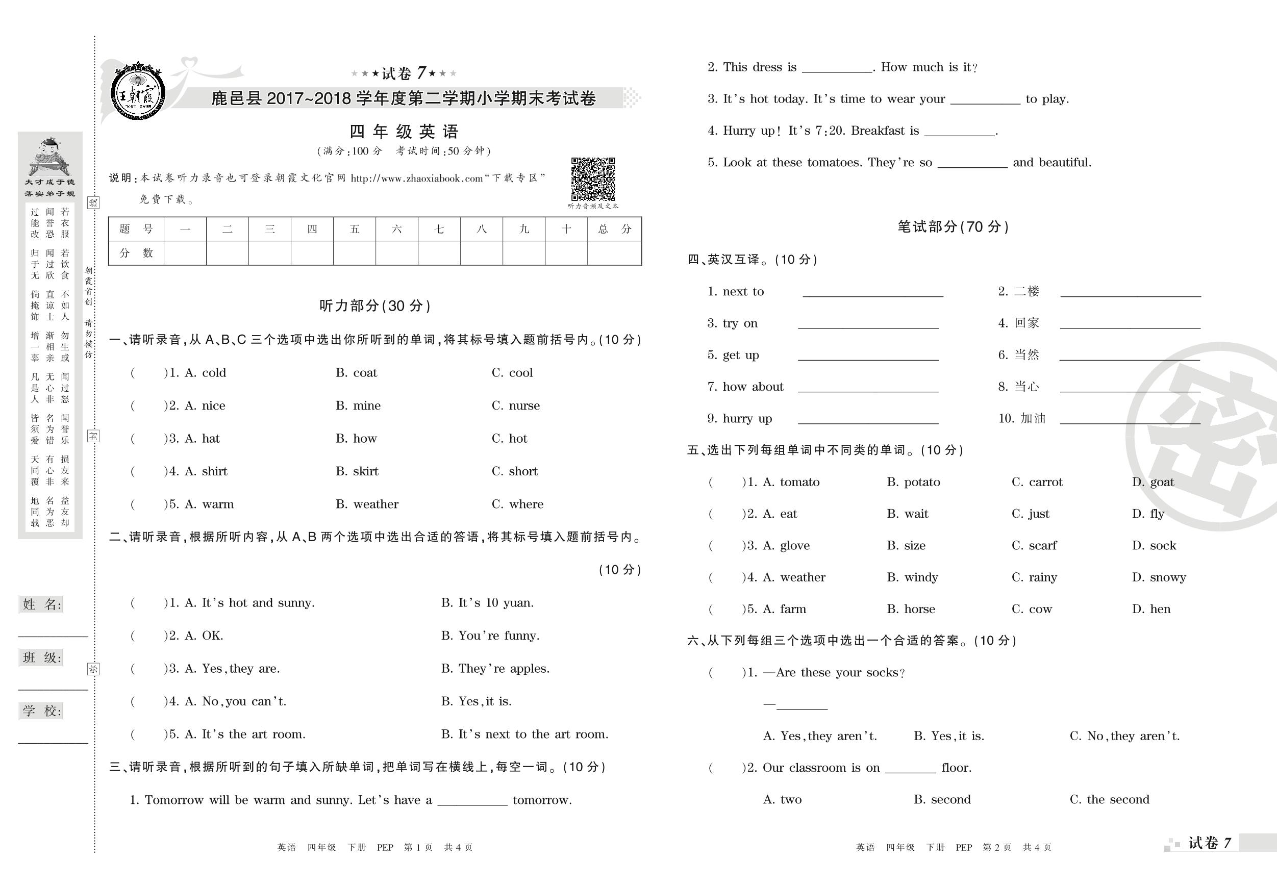 2017-2018学年第二学期周口市鹿邑县四年级英语试卷(PEP版)【7】