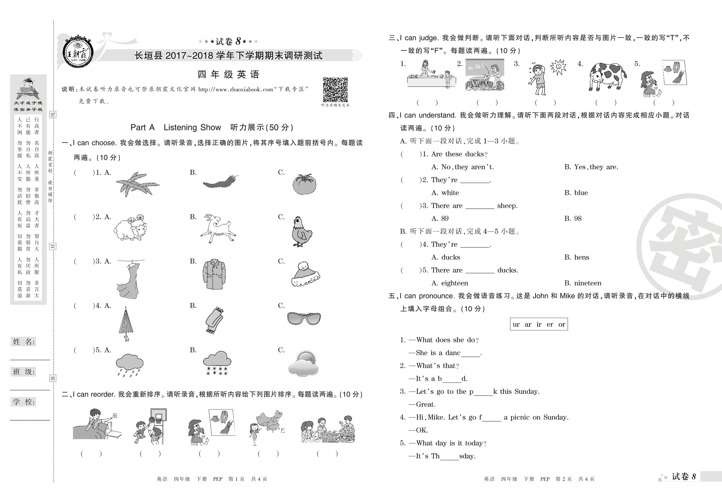 2017-2018学年第二学期新乡市长垣县四年级英语试卷(PEP版)【8】