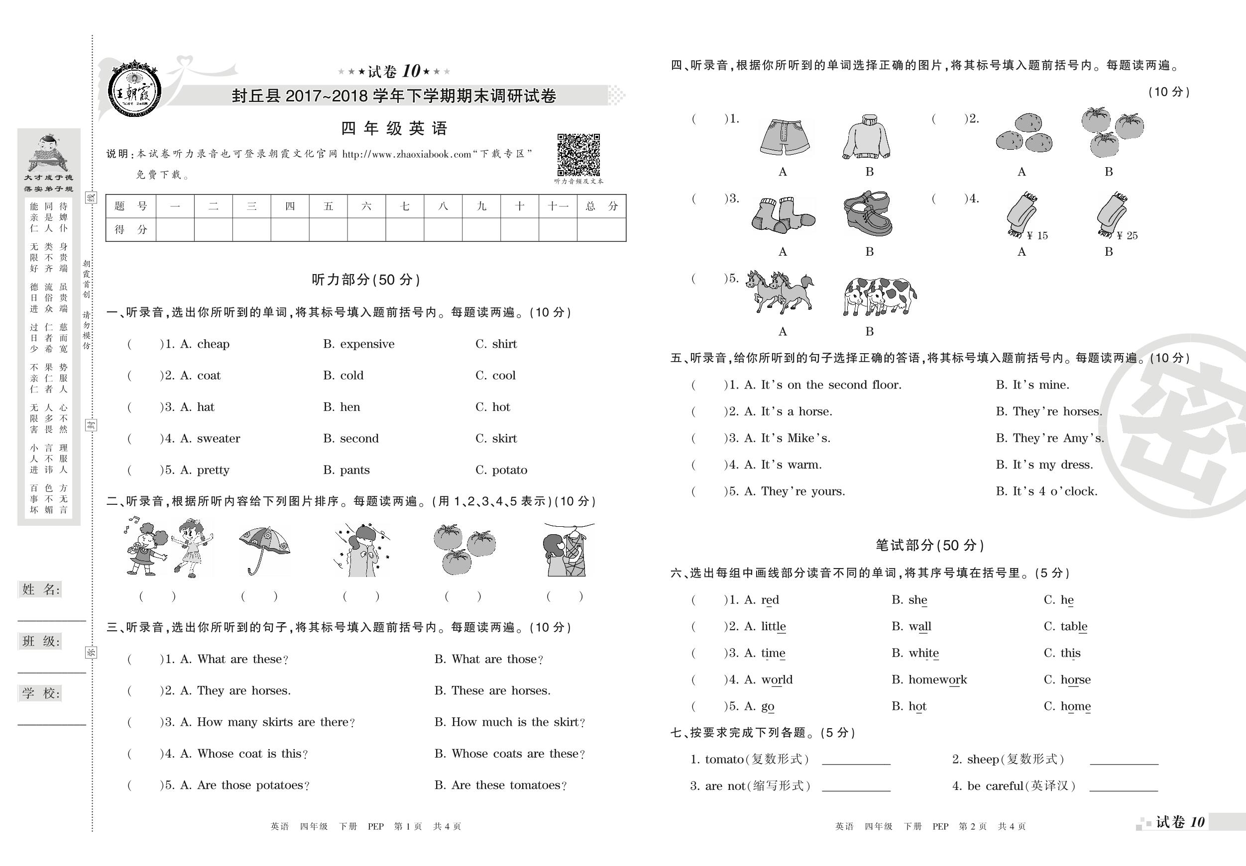 2017-2018学年第二学期新乡市封丘县四年级英语试卷(PEP版)【10】