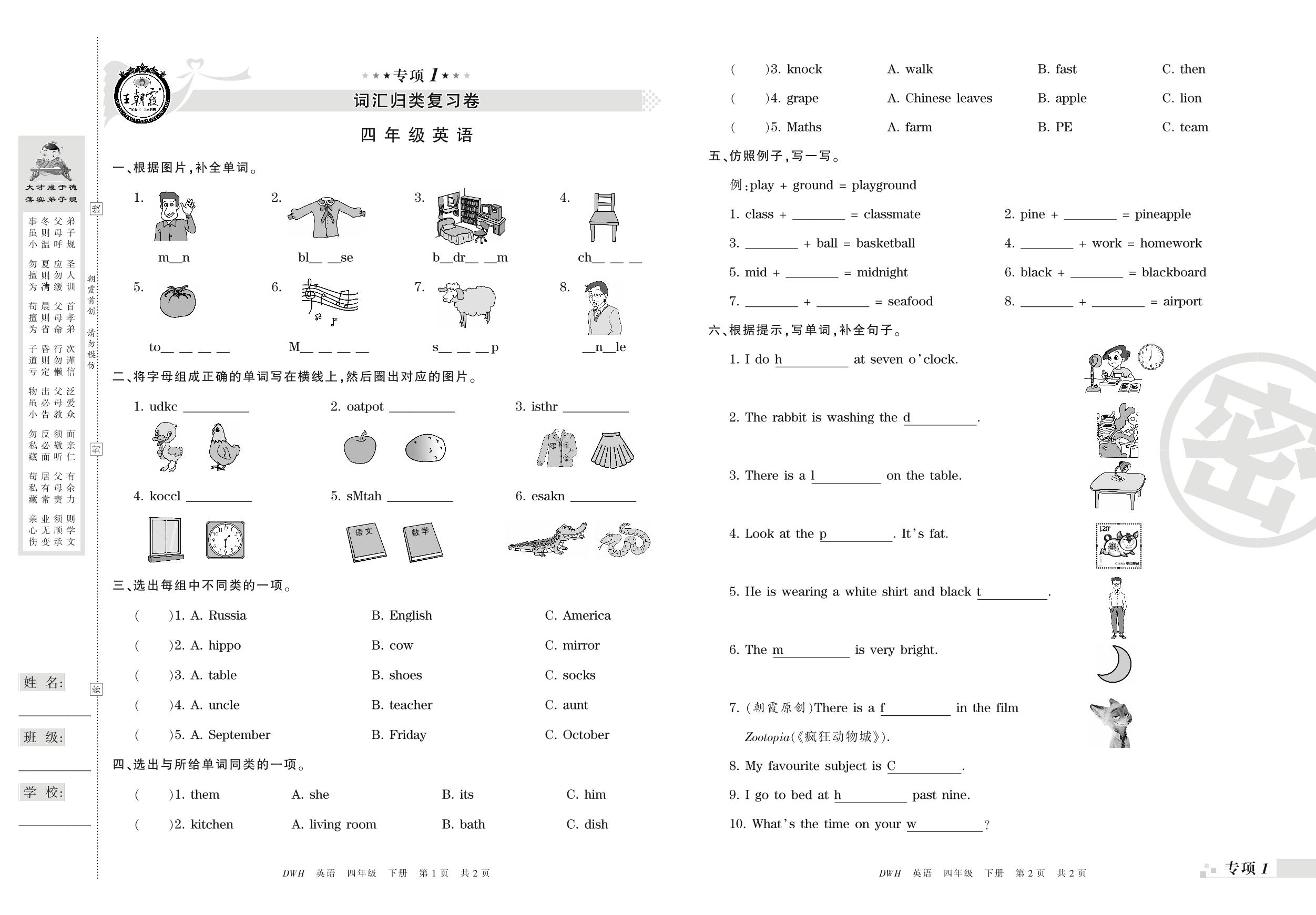 王朝霞期末专项卷——词汇、句子真题归类复习卷四年级下册英语(剑桥版)_R21080795033【0】