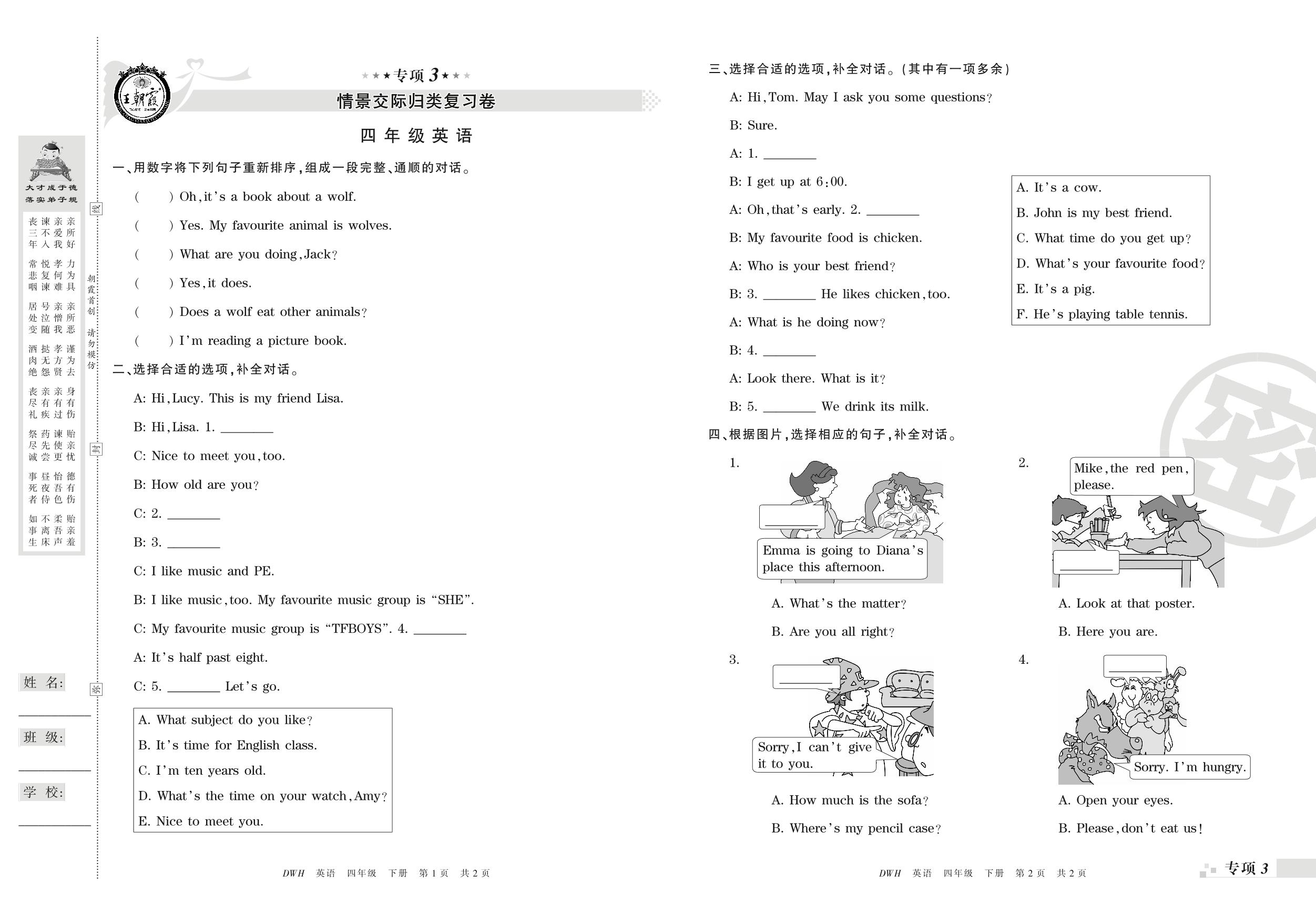 王朝霞期末专项卷——情景交际、阅读理解真题归类复习卷四年级下册英语(剑桥版)_R21080795036【0】