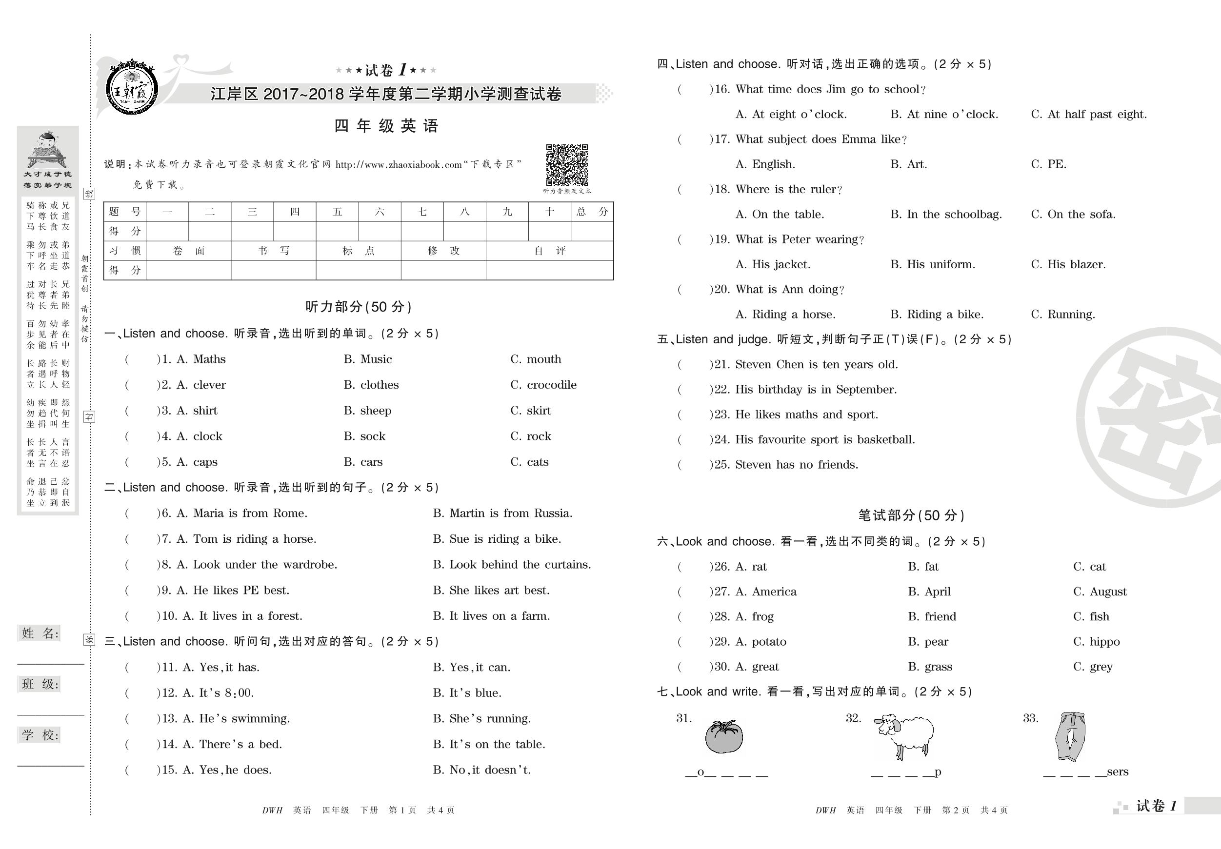 2017-2018学年第二学期武汉市江岸区四年级英语试卷(剑桥版)【1】