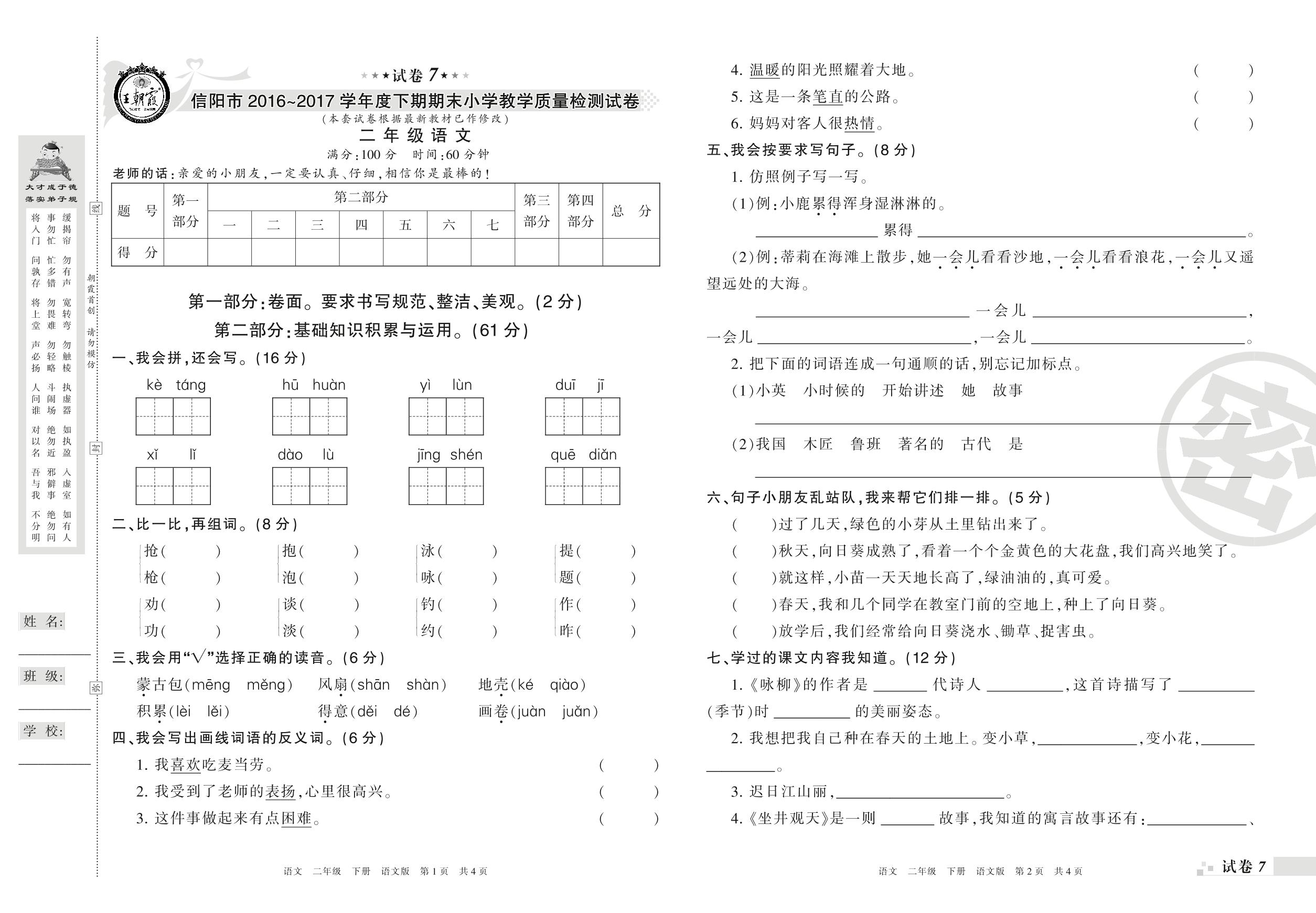 2016-2017学年第二学期信阳市二年级语文试卷(语文版)【7】