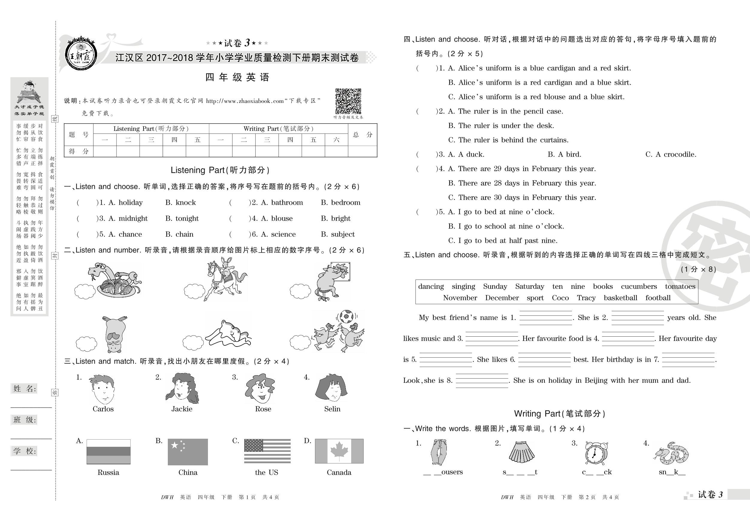 2017-2018学年第二学期武汉市江汉区四年级英语试卷(剑桥版)【3】
