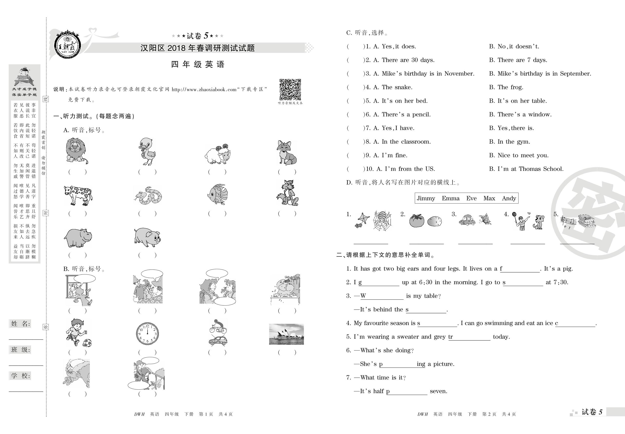 2017-2018学年第二学期武汉市汉阳区四年级英语试卷(剑桥版)【5】