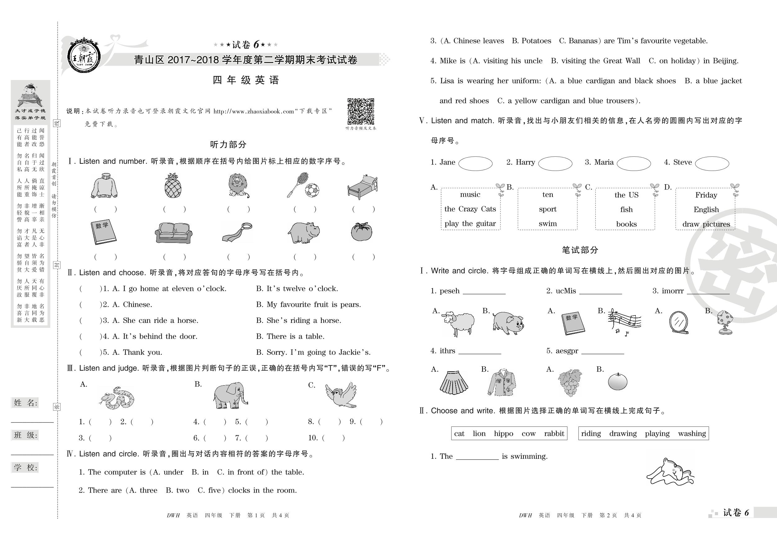 2017-2018学年第二学期武汉市青山区四年级英语试卷(剑桥版)【6】