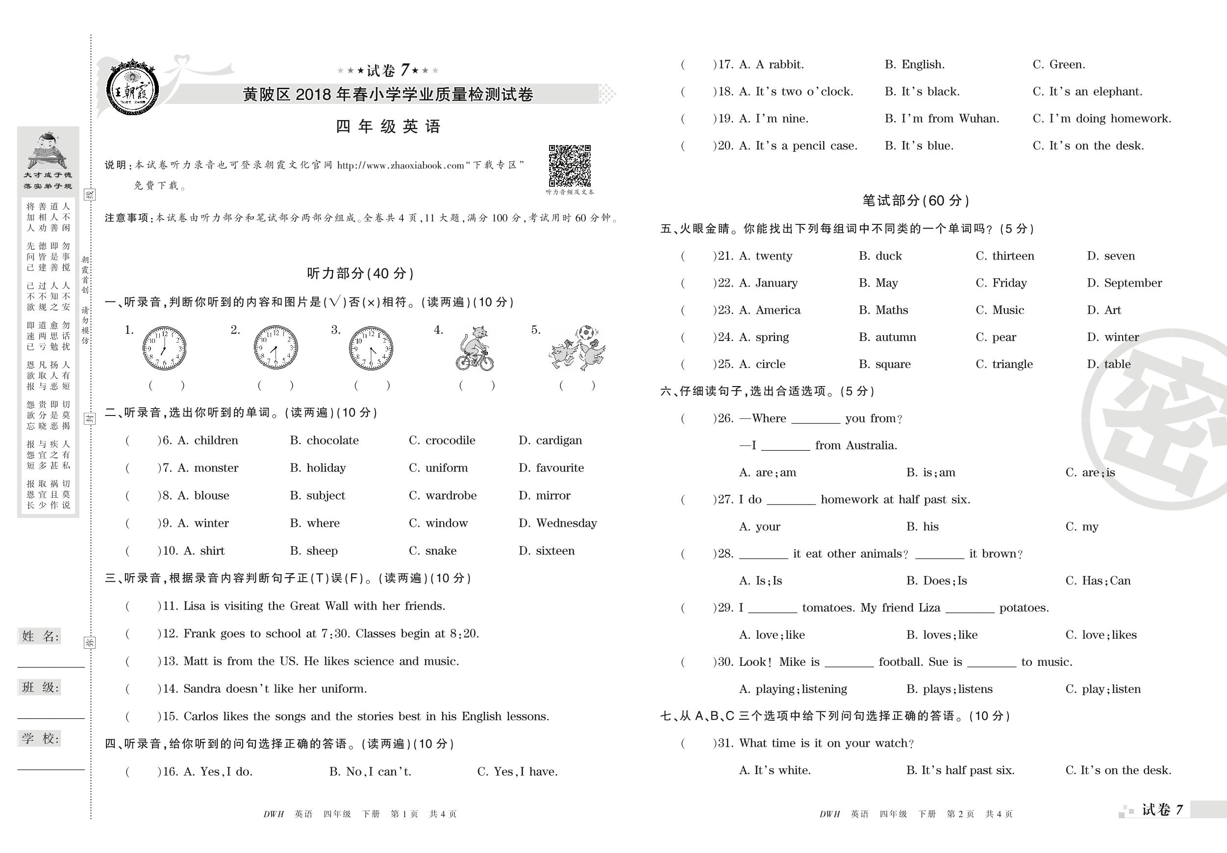 2017-2018学年第二学期武汉市黄陂区四年级英语试卷(剑桥版)【7】