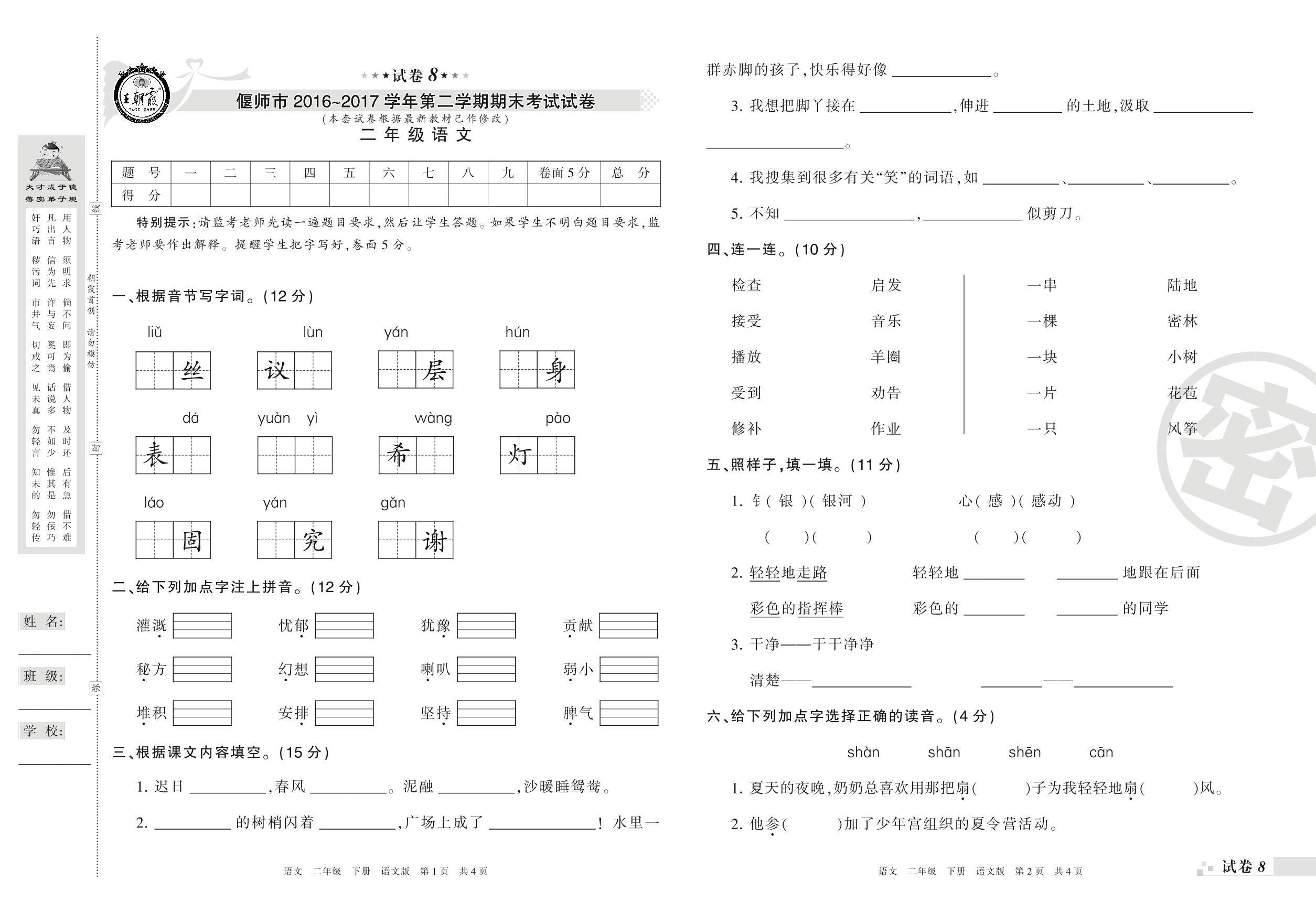 2016-2017学年第二学期偃师市二年级语文试卷(语文版)【8】