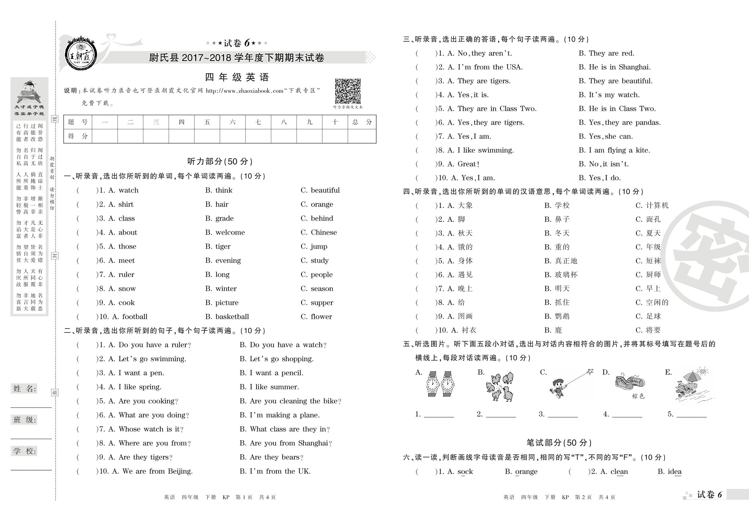 2017-2018学年第二学期开封市尉氏县四年级英语试卷(科普版)【6】