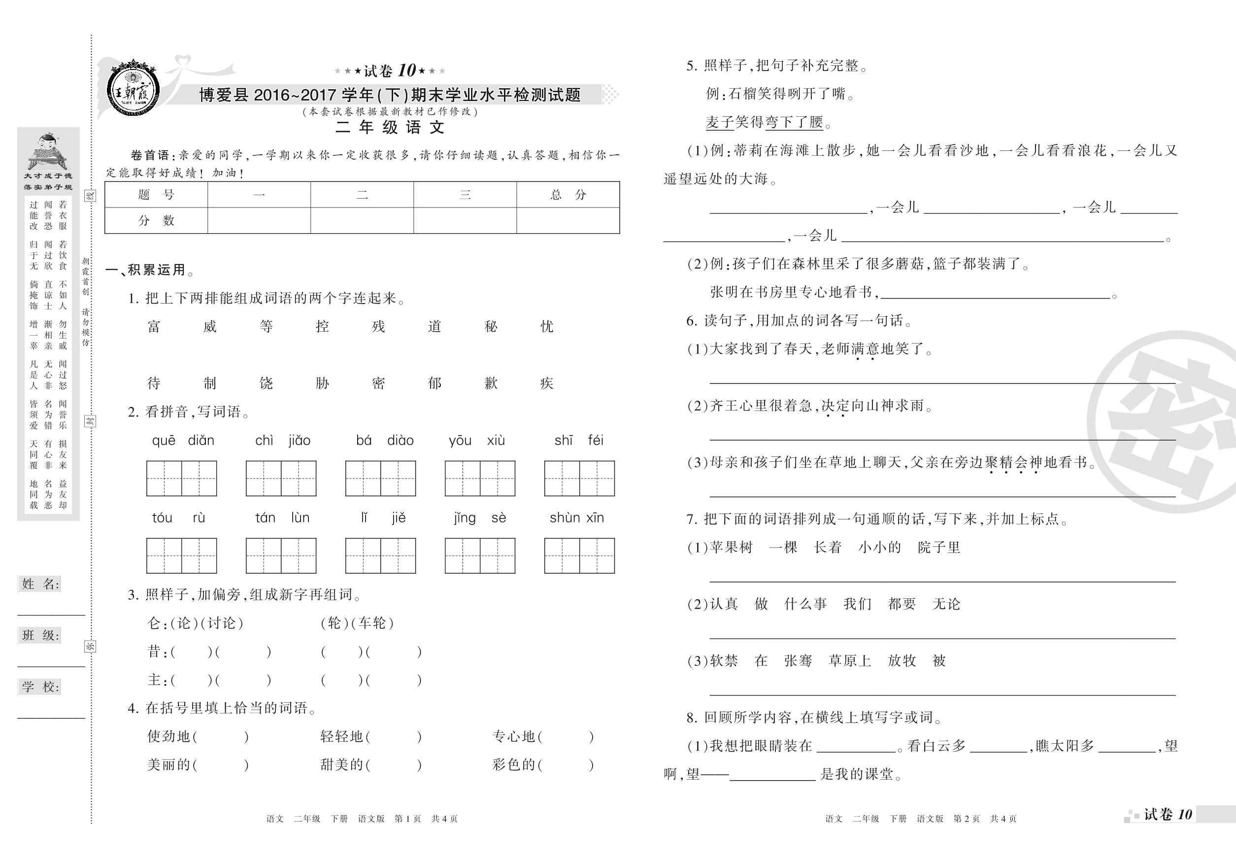 2016-2017学年第二学期焦作市博爱县二年级语文试卷(语文版)【10】