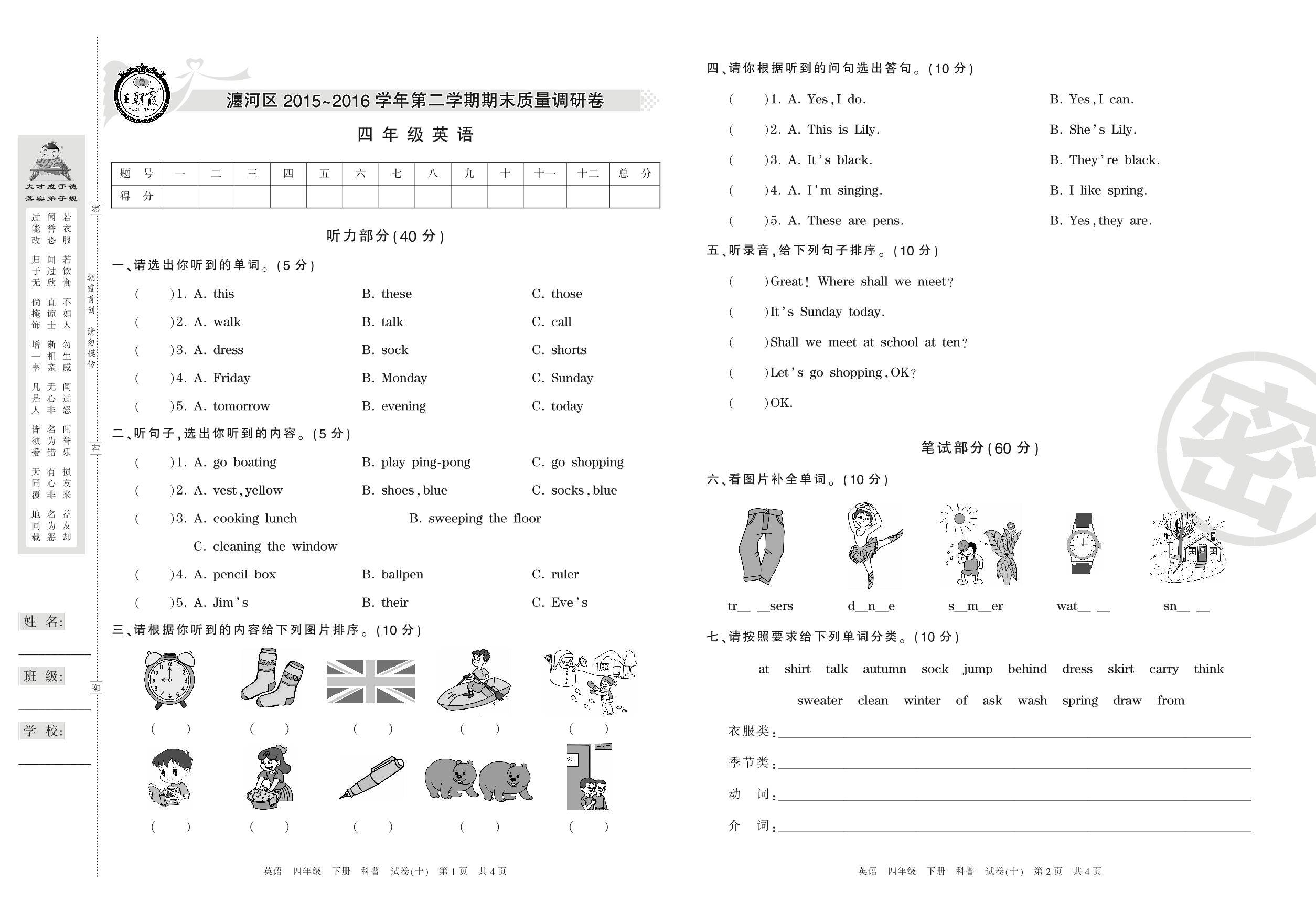 2015-2016学年第二学期洛阳市西工区四年级英语试卷(科普版)【10】