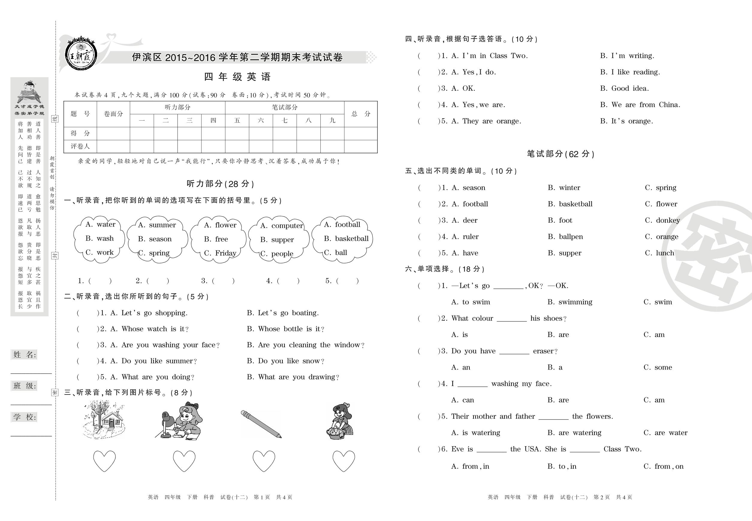 2015-2016学年第二学期洛阳市伊滨区四年级英语试卷(科普版)【12】