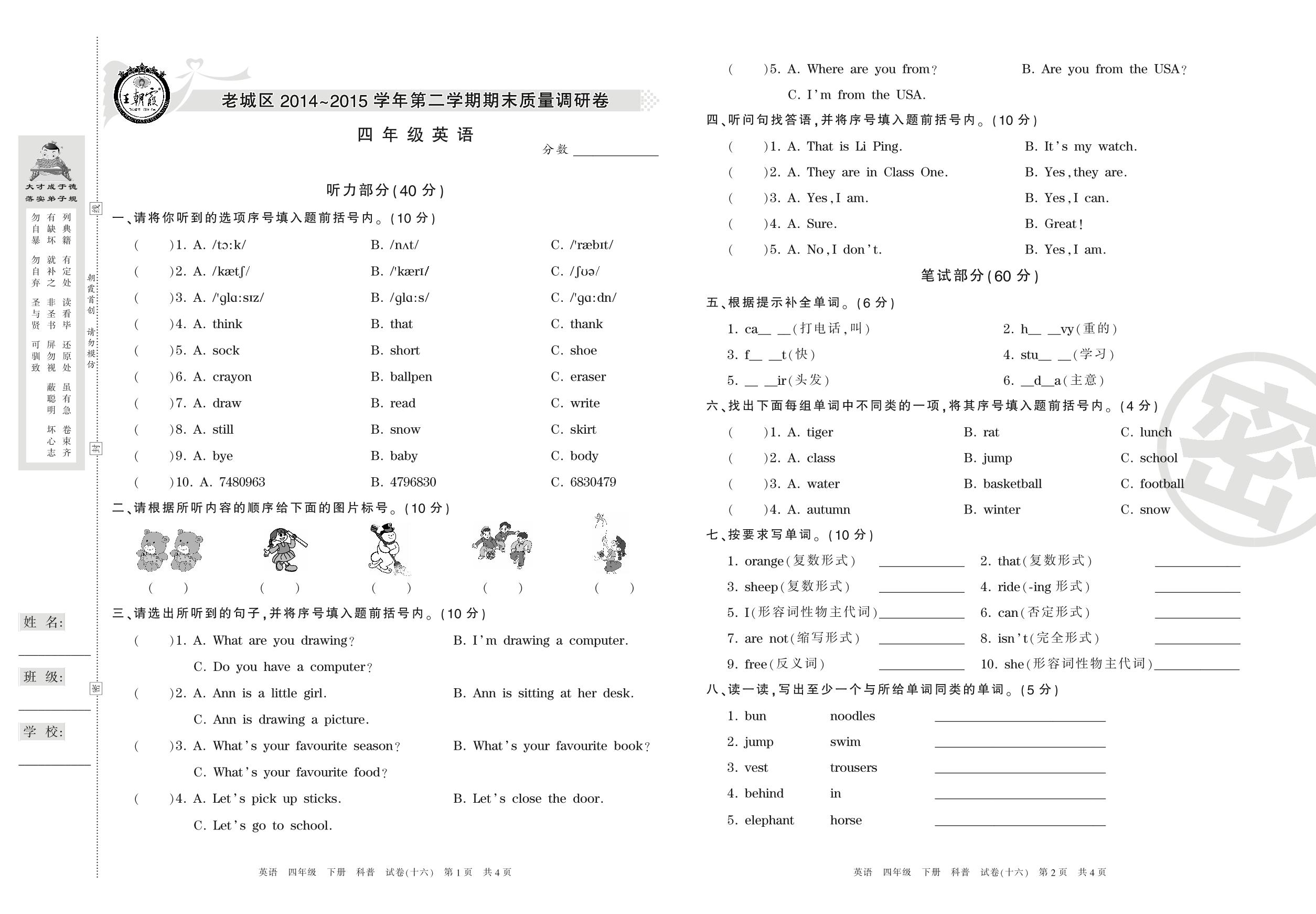 2015-2016学年第二学期洛阳市老城区四年级英语试卷(科普版)【16】