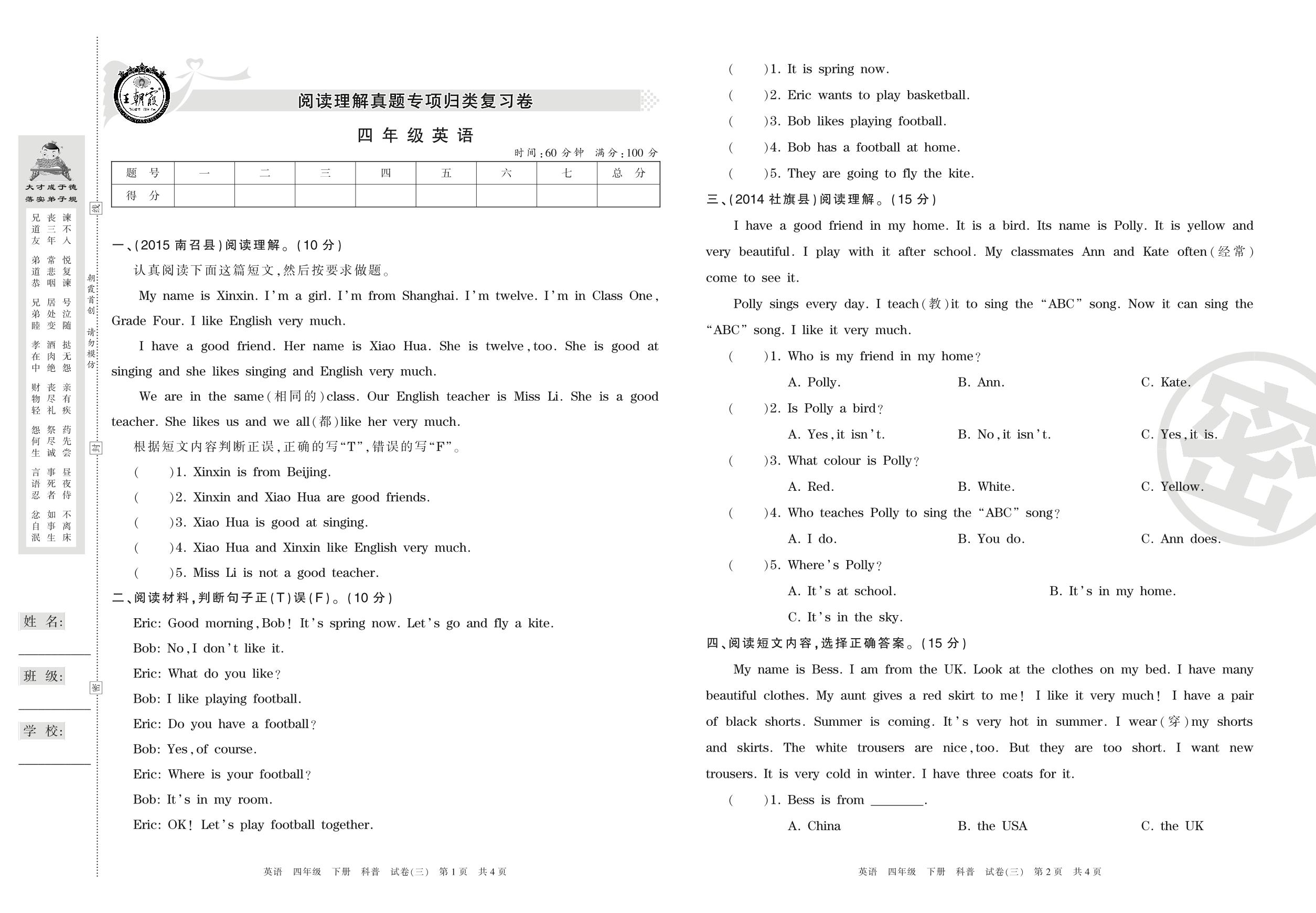 王朝霞期末专项卷四年级下册英语(科普版)_R21080795346【3】