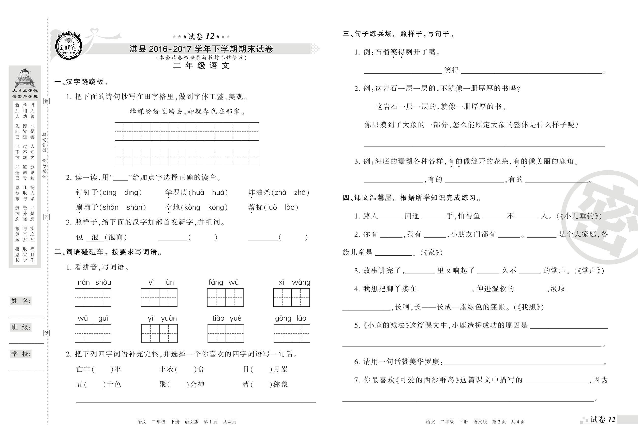 2016-2017学年第二学期鹤壁市淇县二年级语文试卷(语文版)【12】
