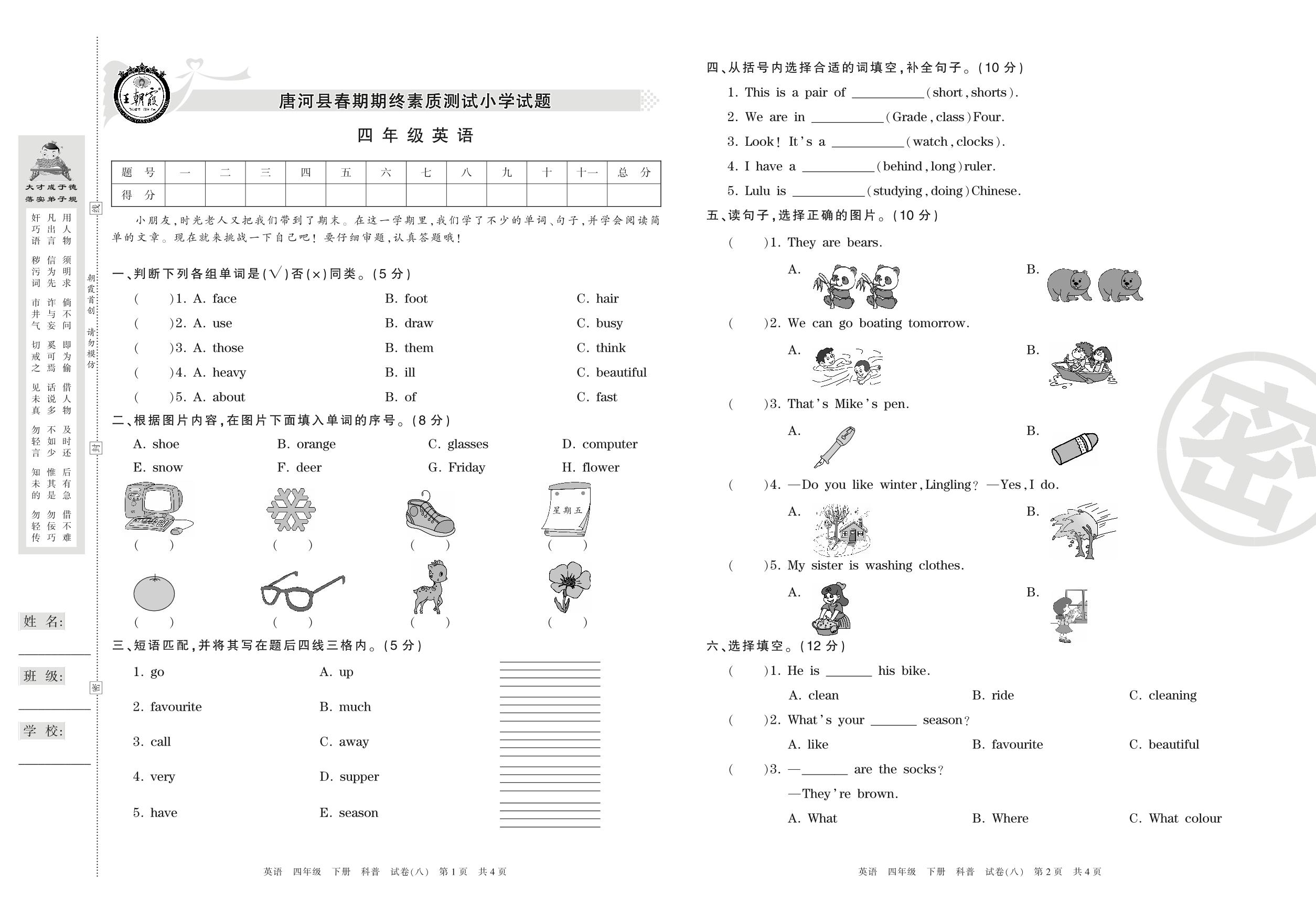 2015-2016学年第二学期南阳市唐河县四年级英语试卷(科普版)【8】
